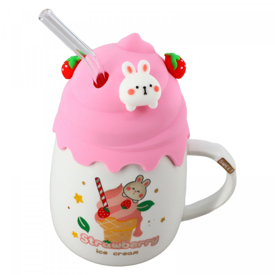 Cana ceramica, Capac silicon, Pai din sticla, Strawberry, NO42, 350 ml, Multicolor