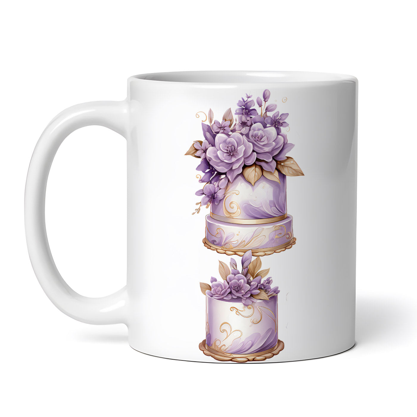 Cana ceramica, Doua torturi cu flori liliachii, NO1073, 330 ml, Multicolor
