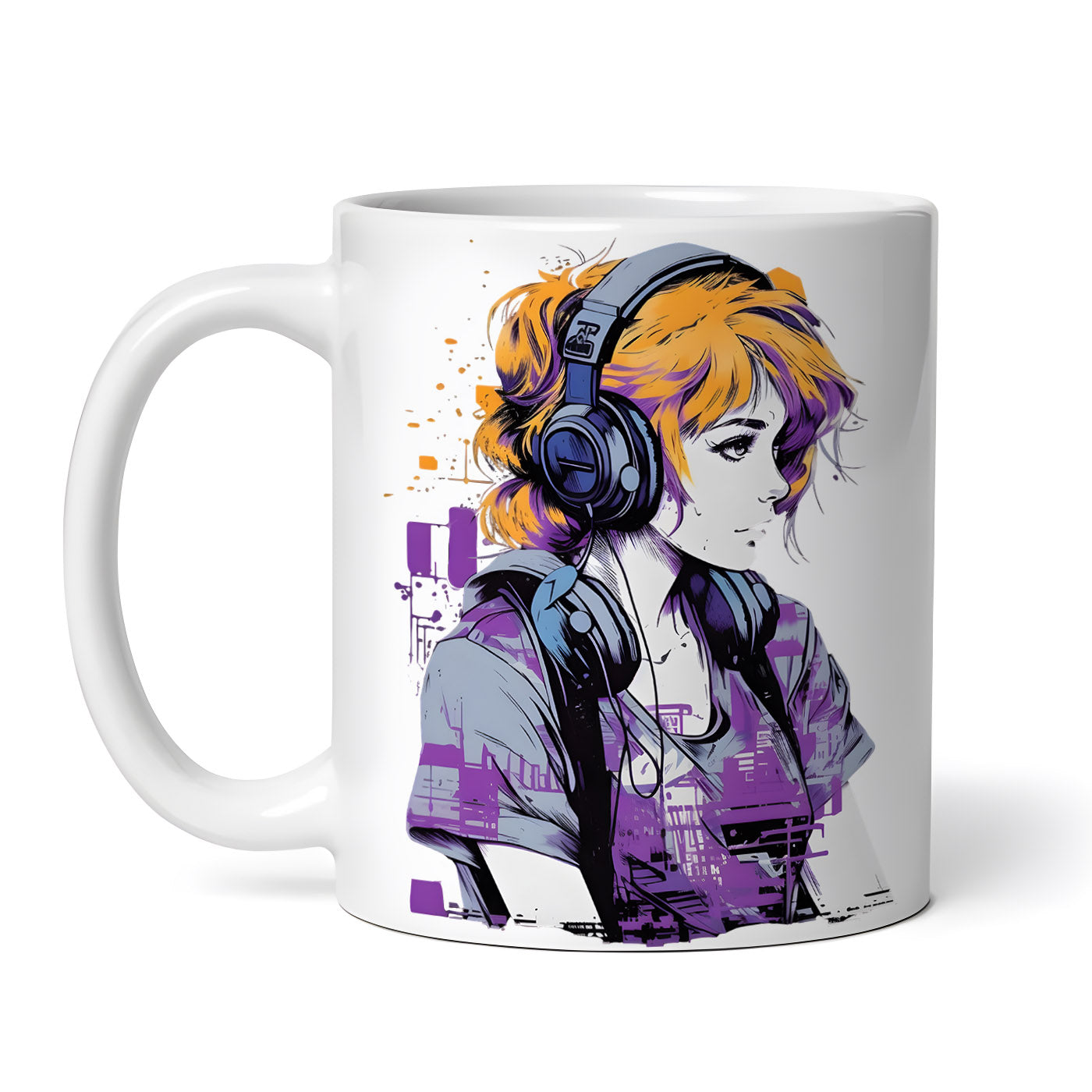 Cana ceramica, Fata cu parul galben si cu casti, NO5342, 330 ml, Multicolor