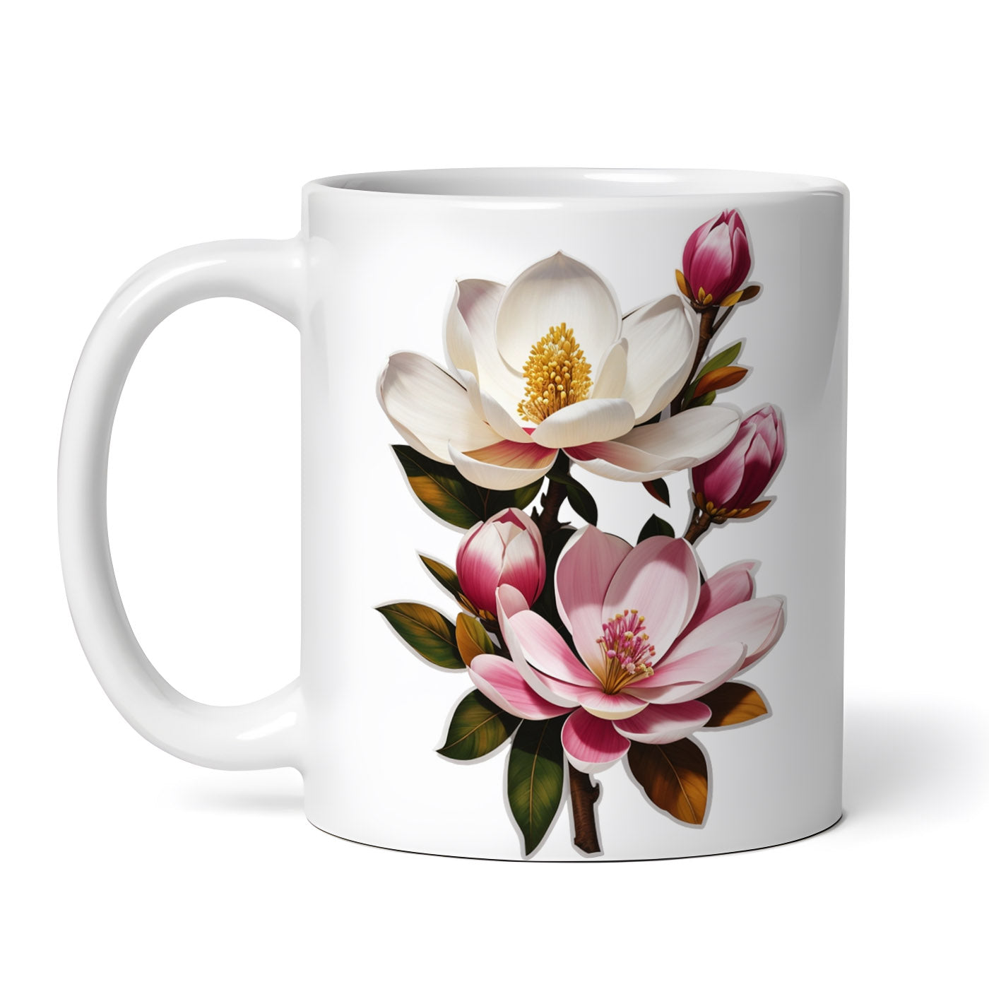 Cana ceramica, Flori de magnolia cu boboci, NO8488, 330 ml, Multicolor
