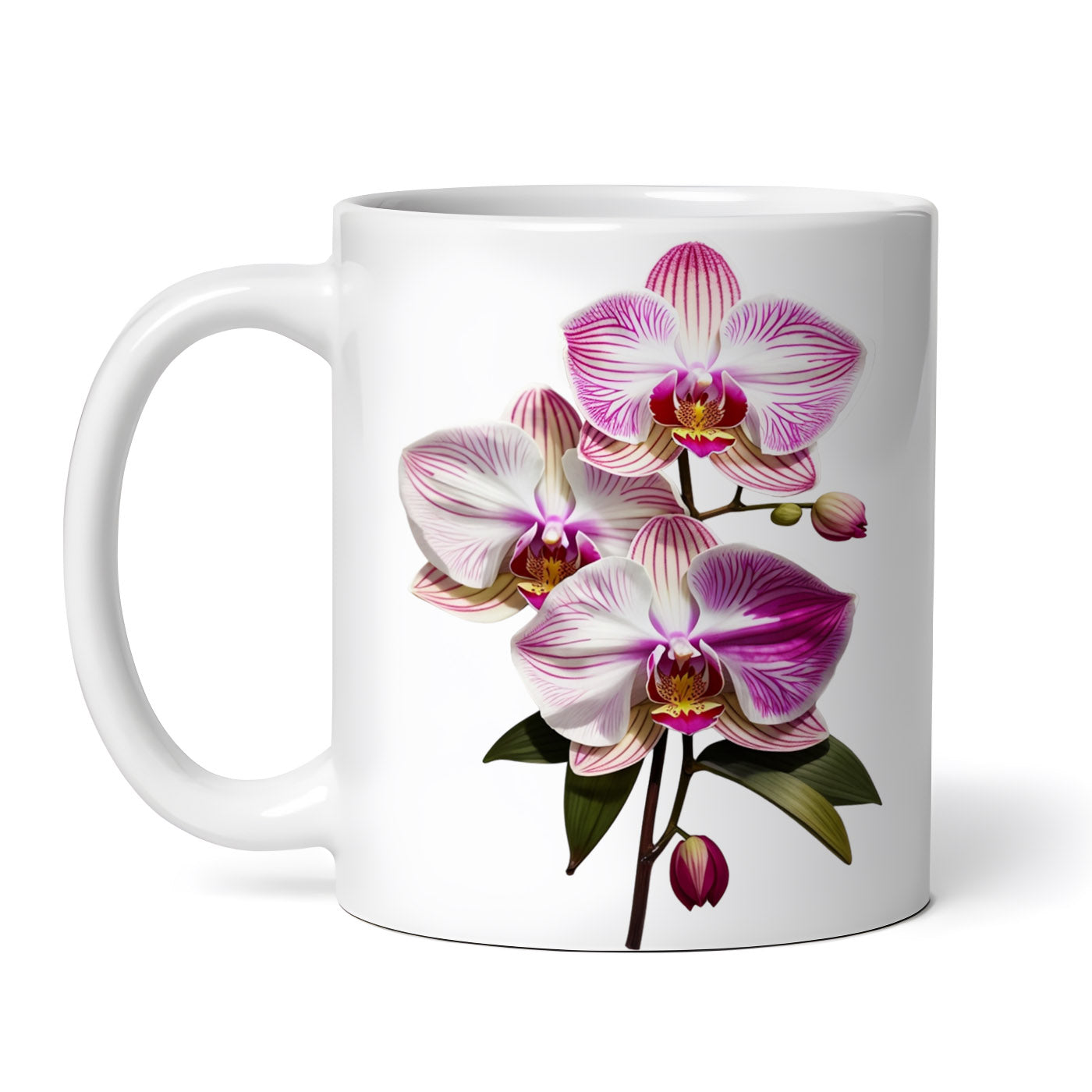 Cana ceramica, Flori de orhidee cu boboci, NO8634, 330 ml, Multicolor