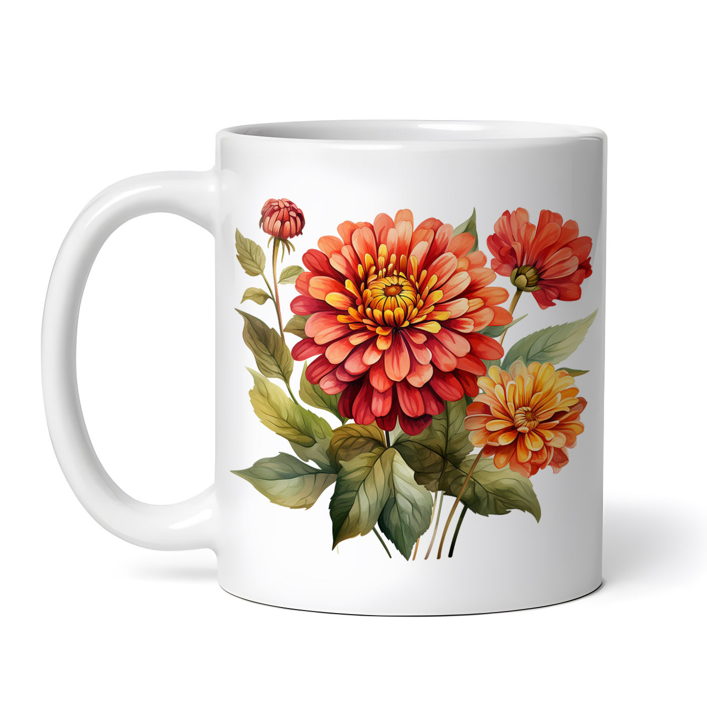 Cana ceramica, Flori zinnia cu boboci, NO6382, 330 ml, Multicolor