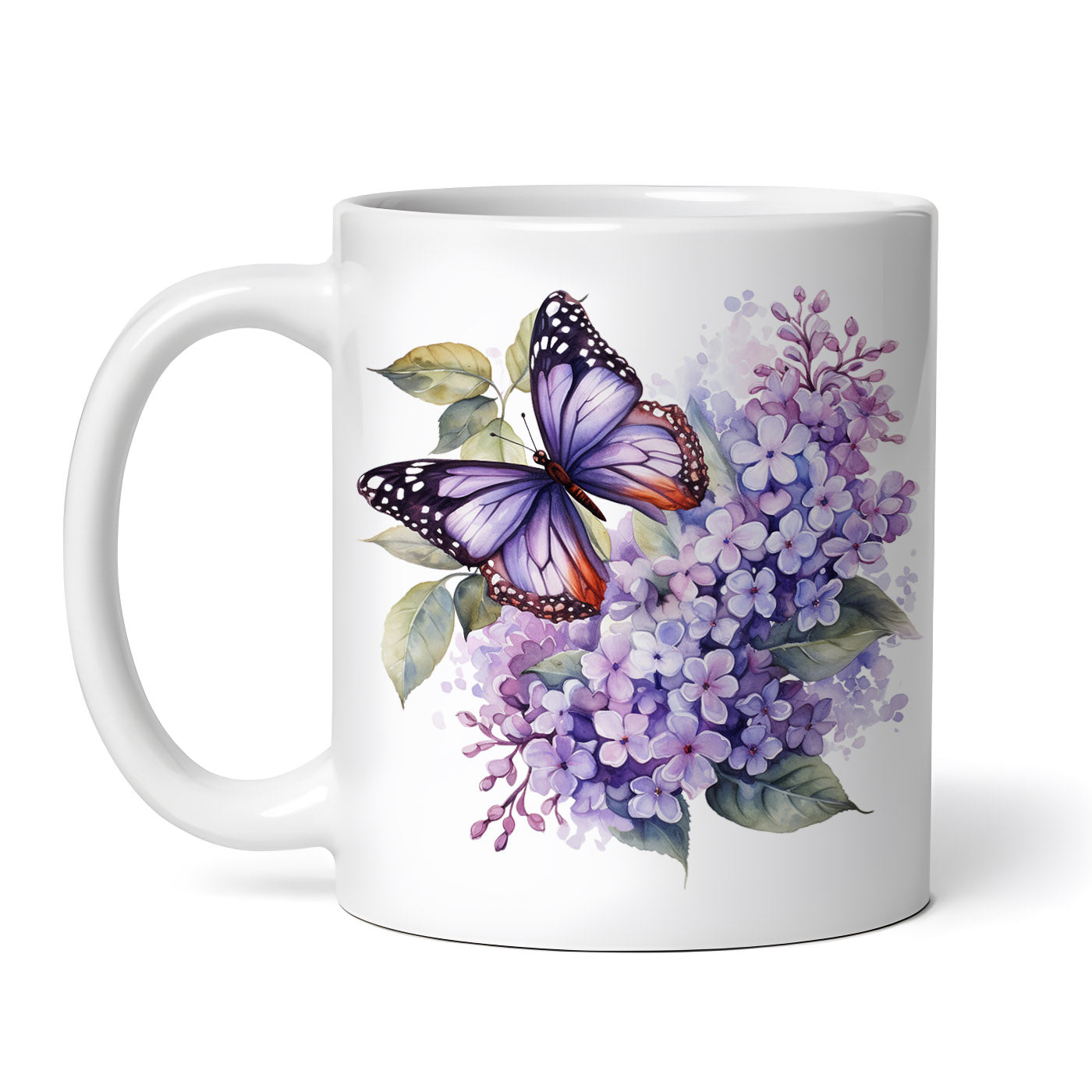 Cana ceramica, Fluture purpuriu pe liliac, NO3413, 330 ml, Multicolor