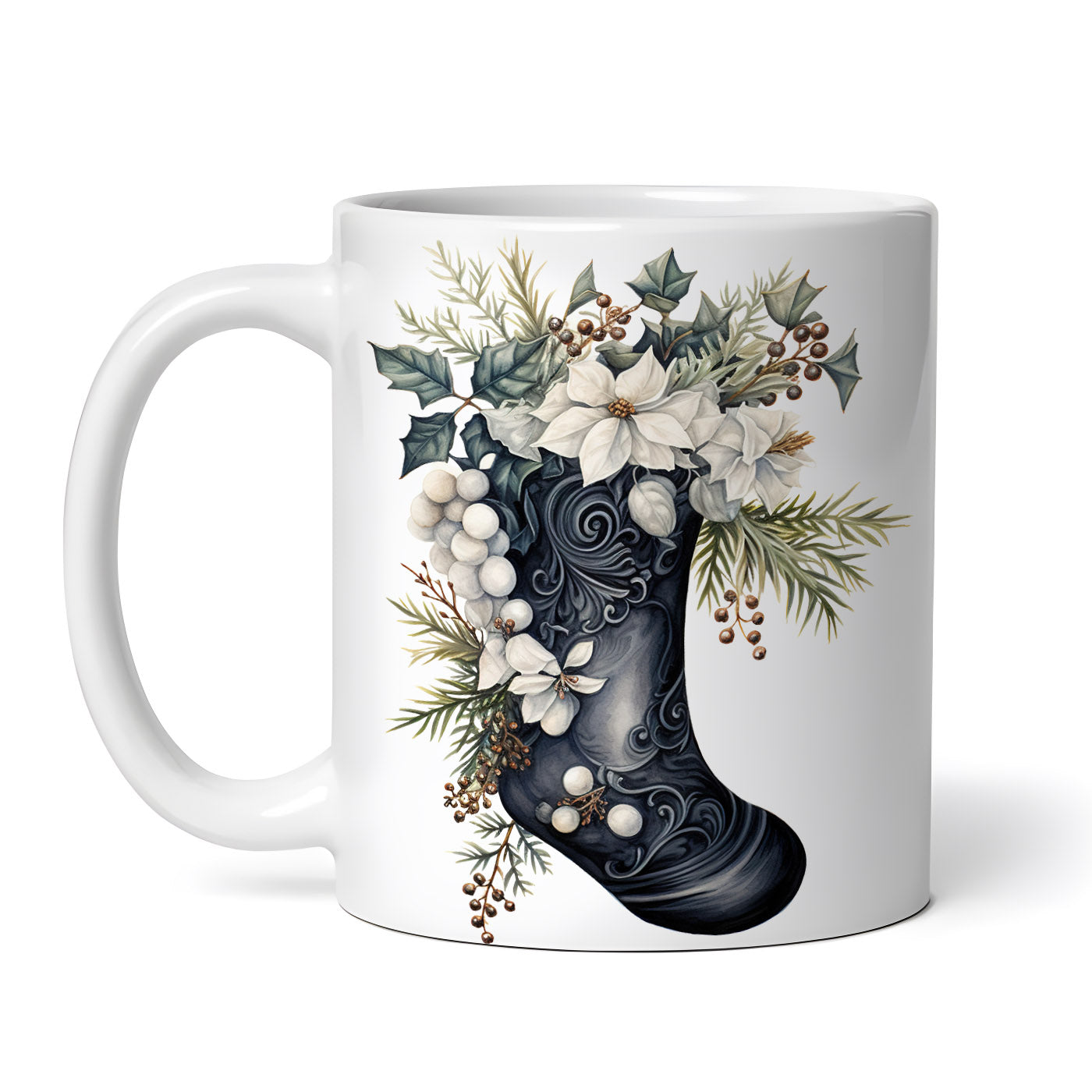 Cana ceramica, Ghetuta neagra cu flori albe, NO1356, 330 ml, Multicolor