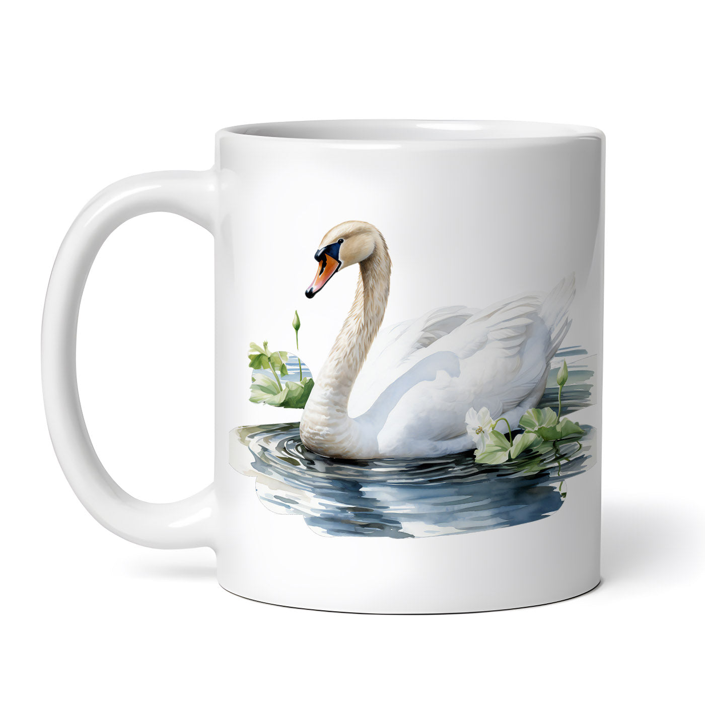 Cana ceramica, Lebeda alba pe lac cu flori albe, NO6164, 330 ml, Multicolor