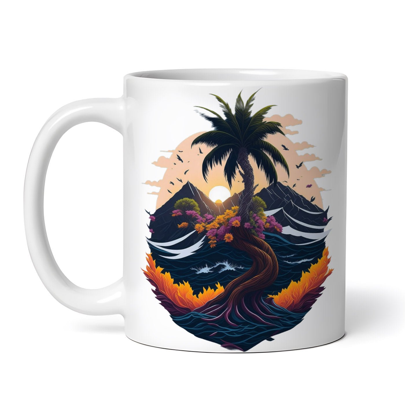 Cana ceramica, Peisaj de munte cu palmieri, NO6605, 330 ml, Multicolor