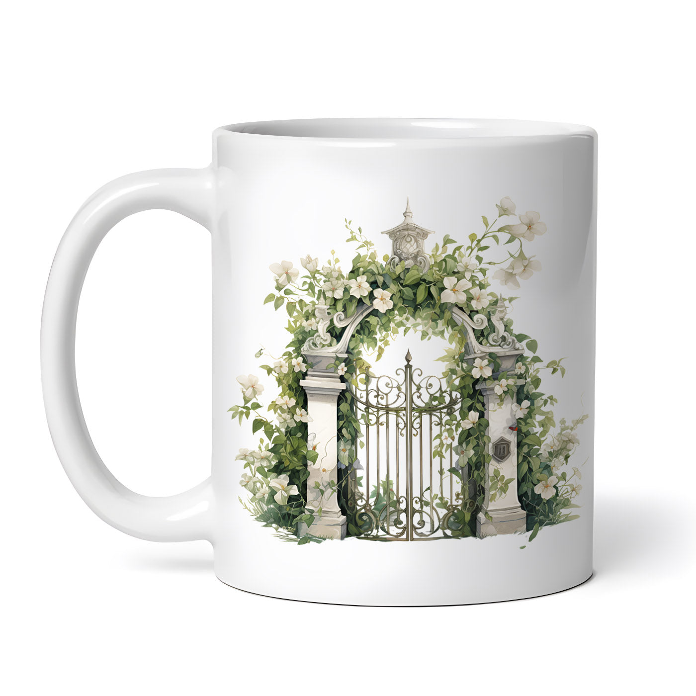Cana ceramica, Poarta cu flori albe, NO4010, 330 ml, Multicolor