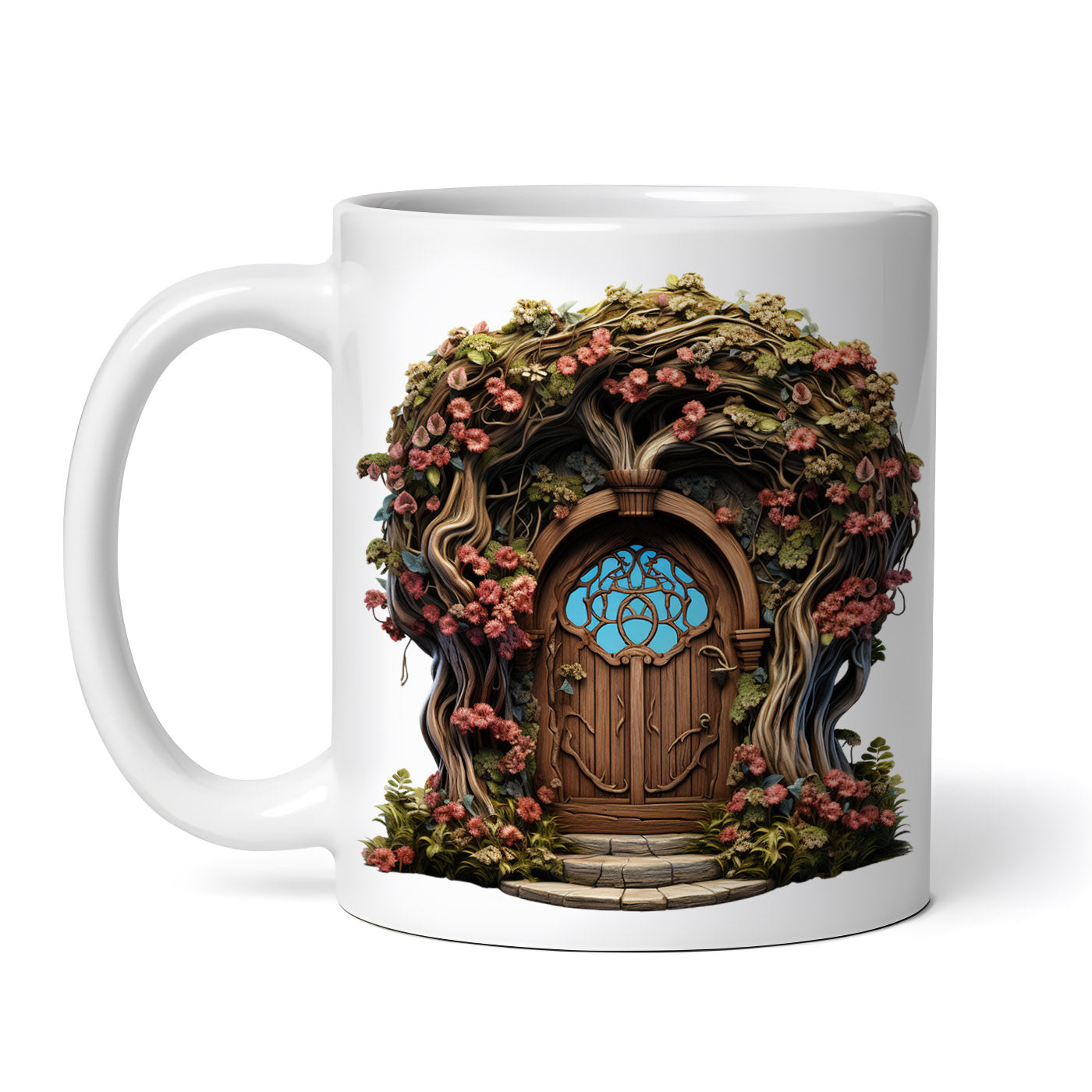 Cana ceramica, Poarta de lemn cu flori rosii, NO1822, 330 ml, Multicolor