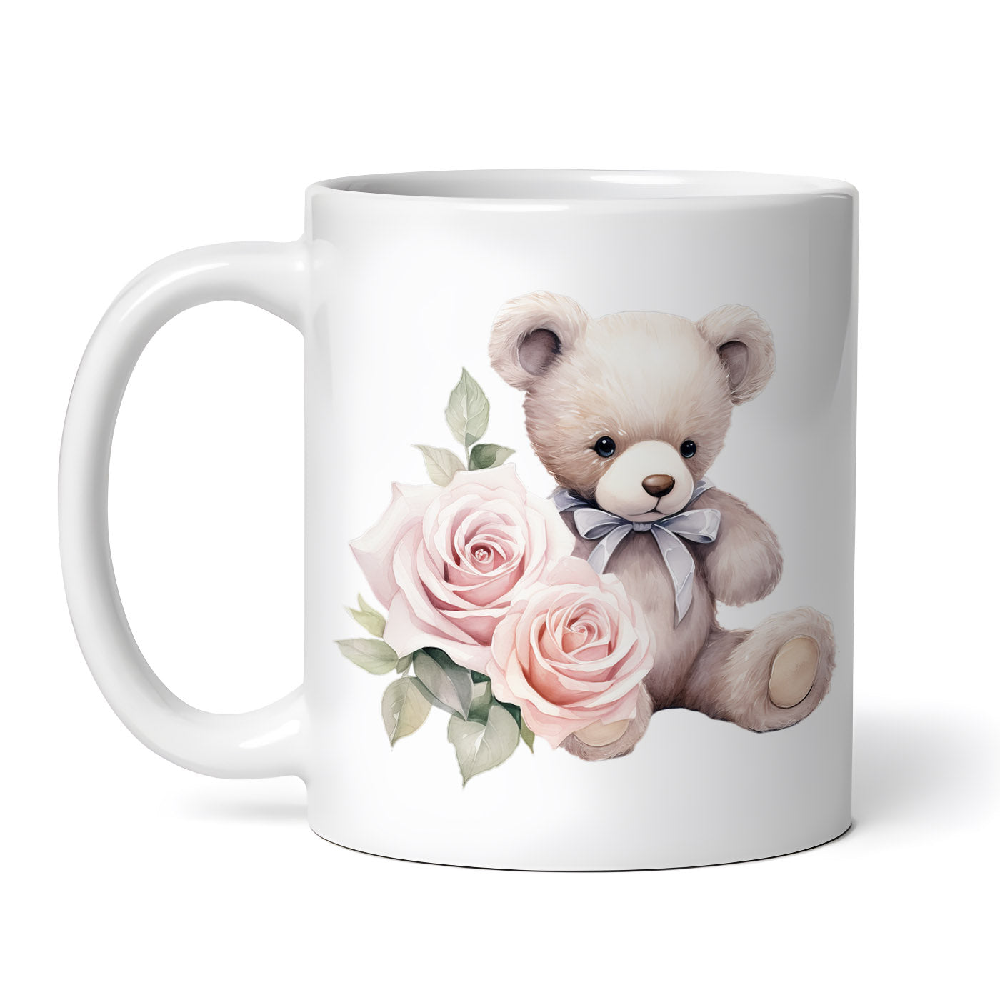 Cana ceramica, Sfantul Valentin Urs cu funda alba si doi trandafiri roz, NO4391, 330 ml, Multicolor