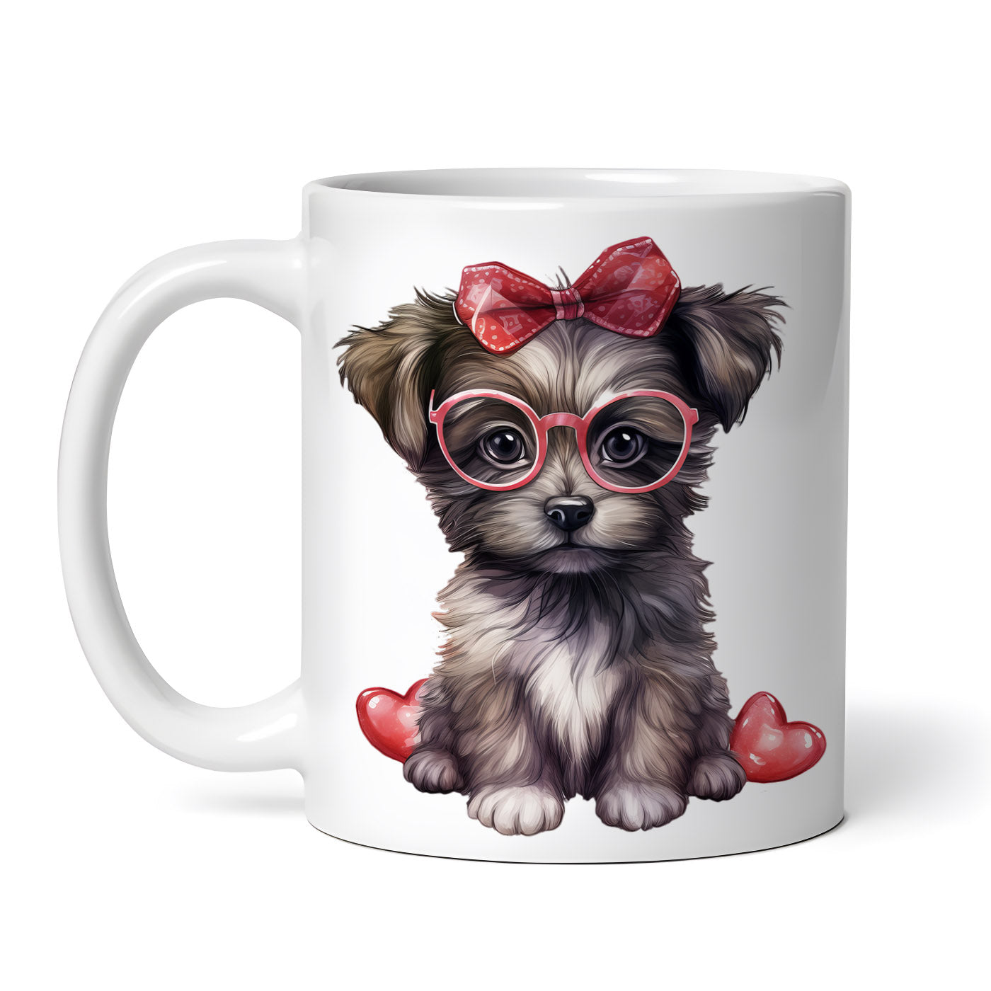 Cana ceramica, Yorkshire Terrier cu ochelari funda rosie si inimioare, NO797, 330 ml, Multicolor
