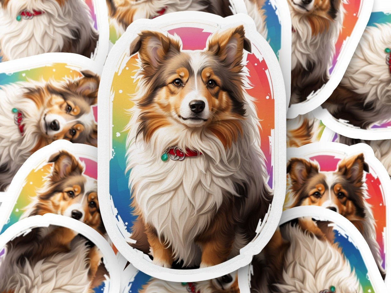 Set 12 bucati, Sticker decorativ, Caine Ciobanescde Shetland cu zgarda, Rezistent la apa, NO3554, 6 cm, Multicolor