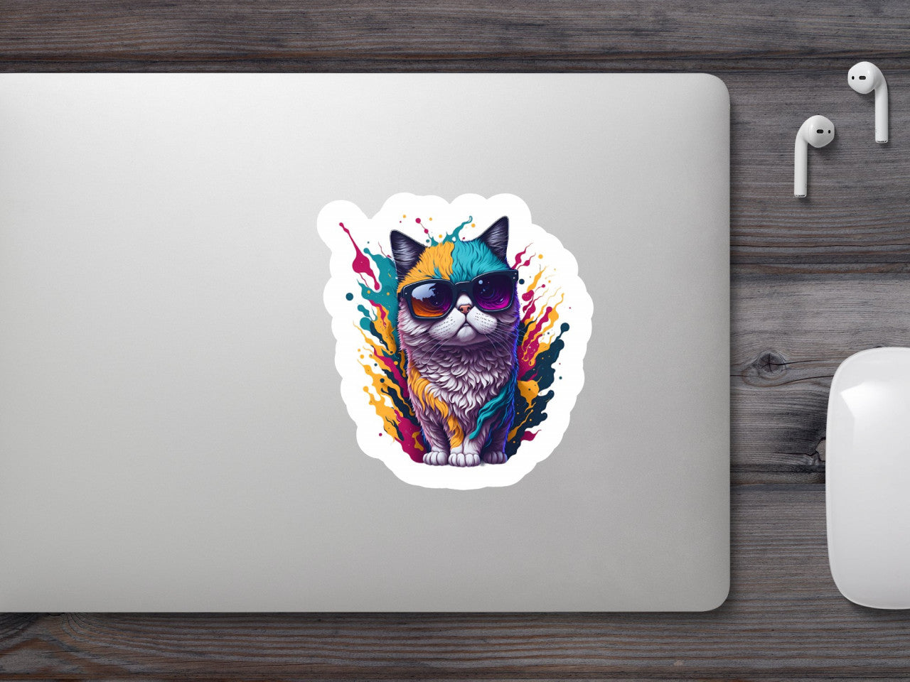 Set 12 bucati, Sticker decorativ, Pisica cu ochelari de soare, Rezistent la apa, NO3947, 6 cm, Multicolor