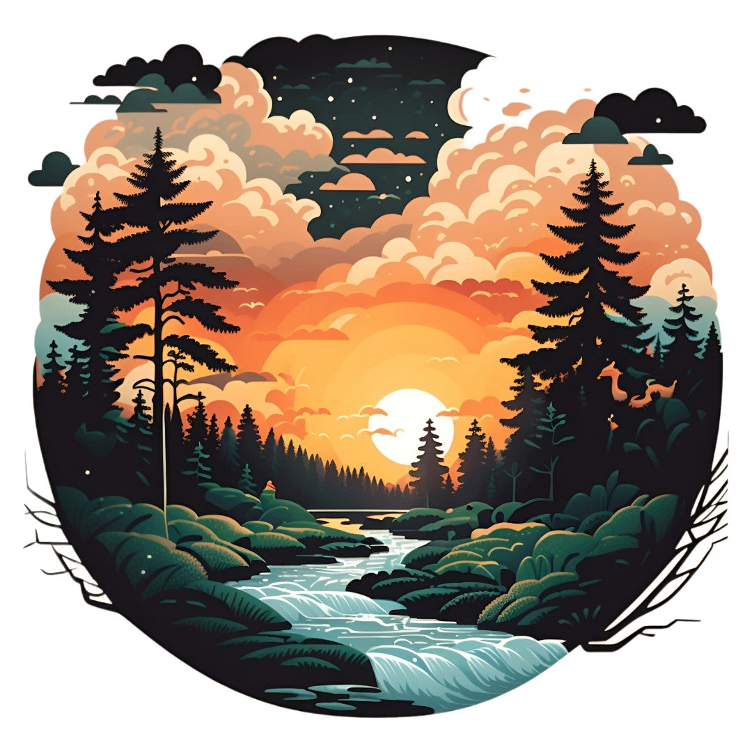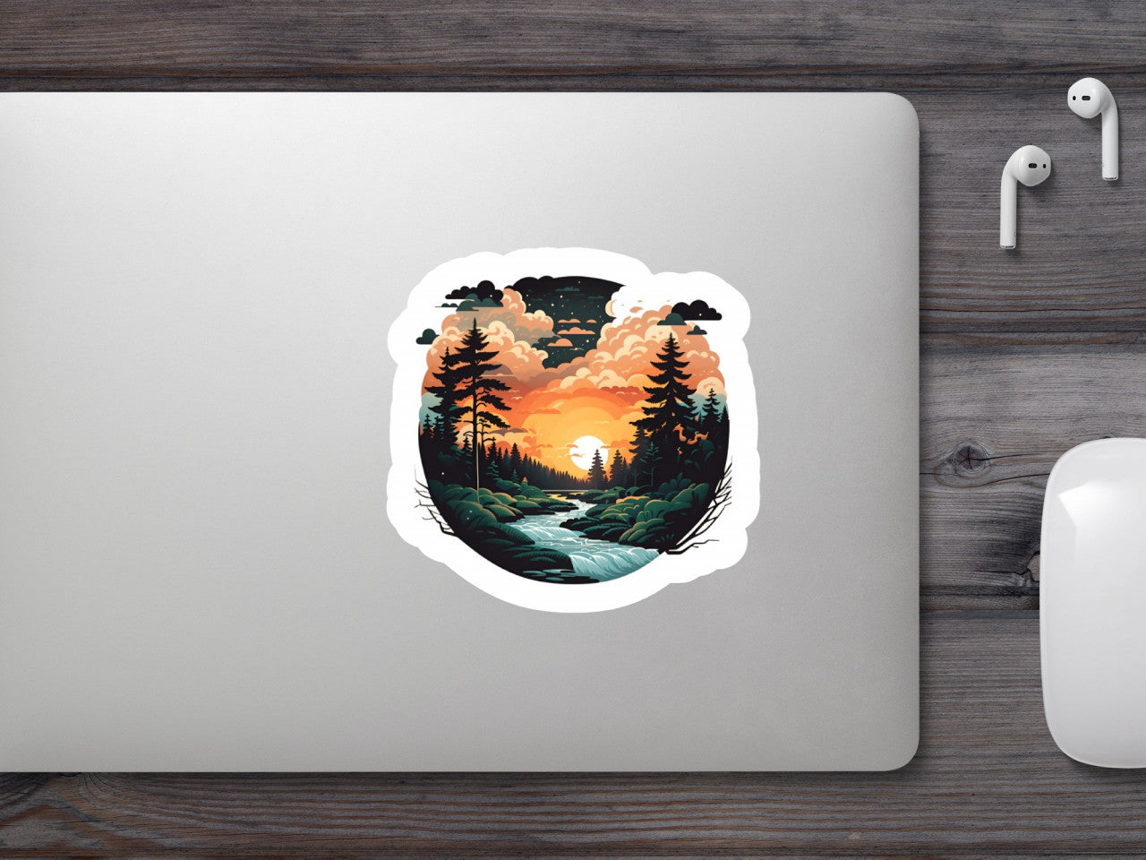 Set 2 bucati, Sticker decorativ, Peisaj padure rasarit, Rezistent la apa, NO6297, 16 cm, Multicolor