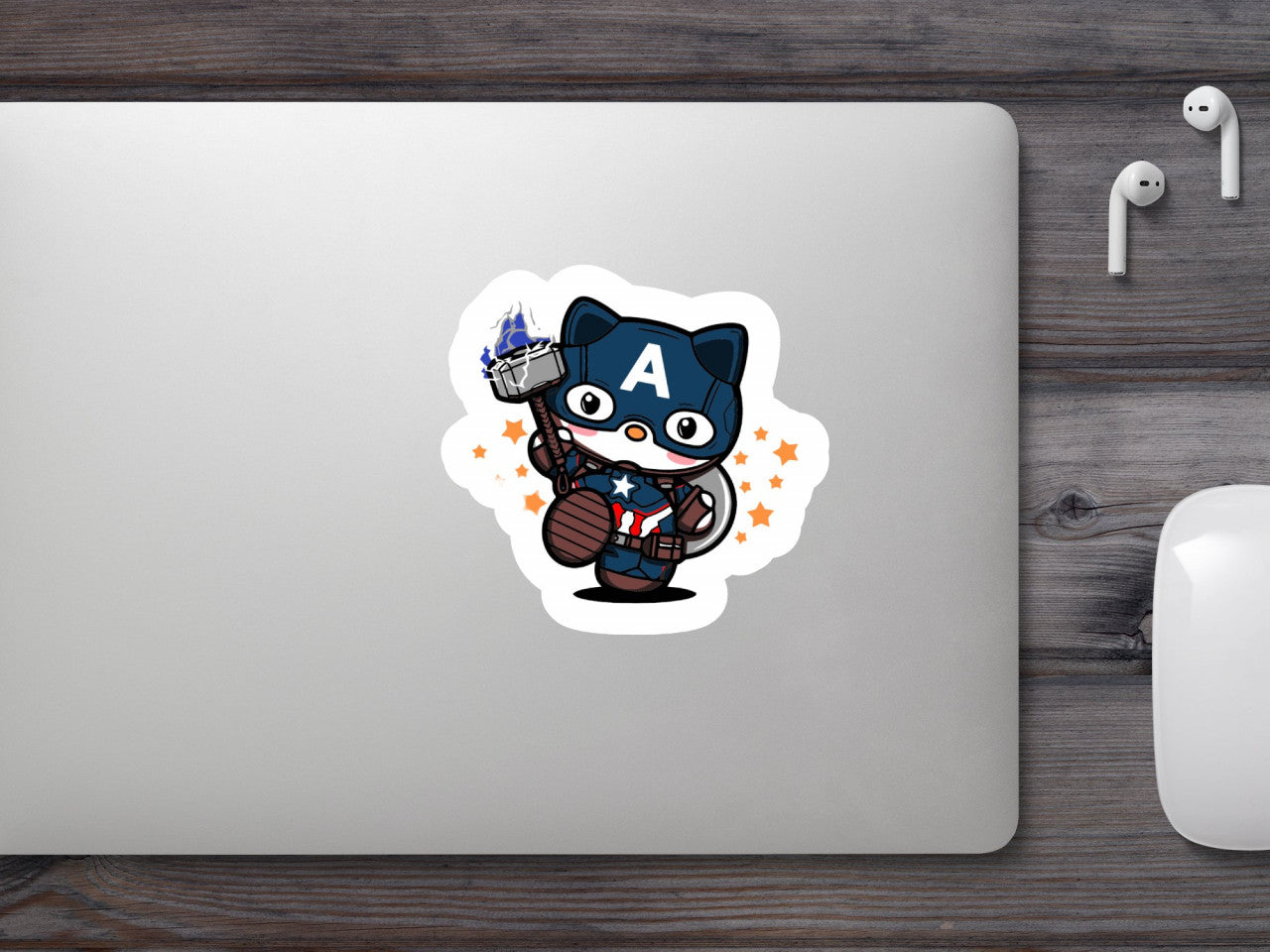 Set 4 bucati, Sticker decorativ, Captain America Hello Kitty supererou, Rezistent la apa, NO8727, 10 cm, Multicolor