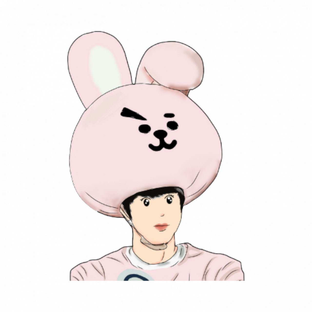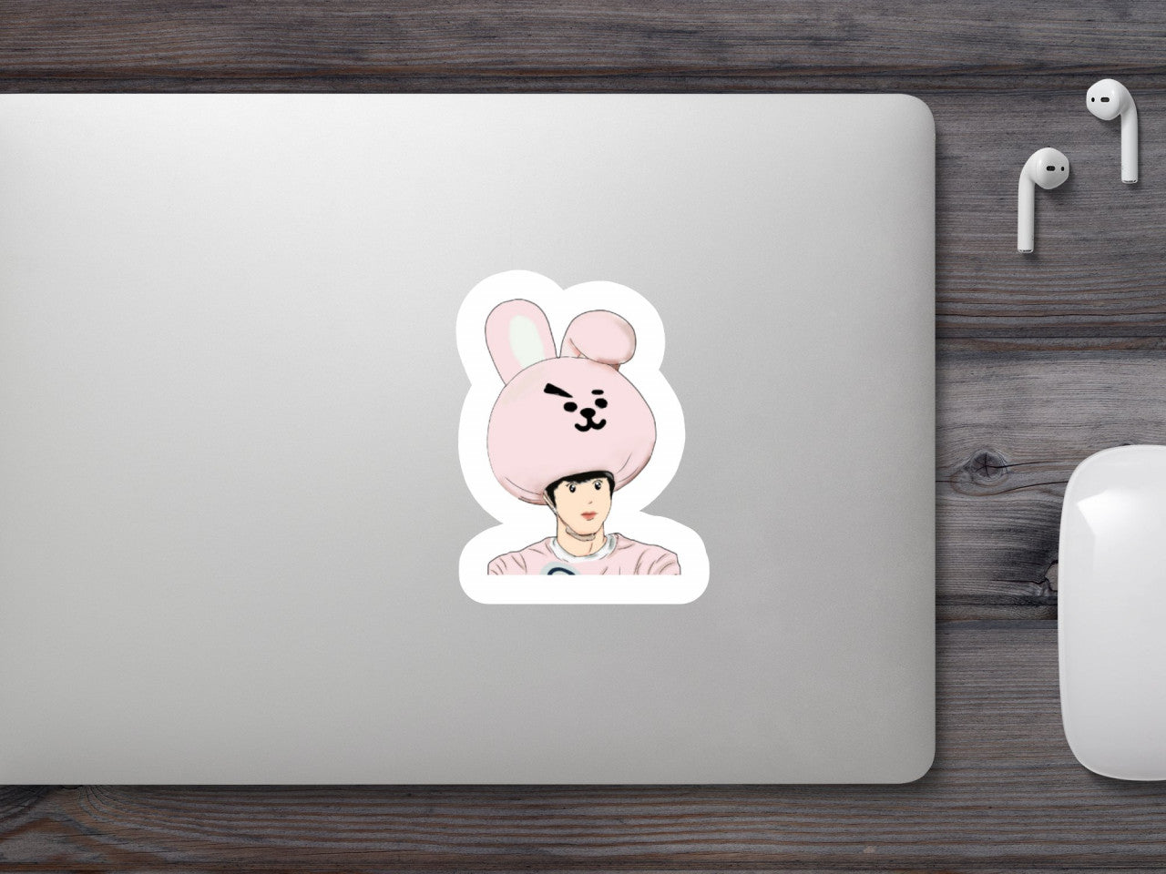 Set 4 bucati, Sticker decorativ, Jin BTS cu caciula iepure roz, Rezistent la apa, NO9801, 10 cm, Multicolor