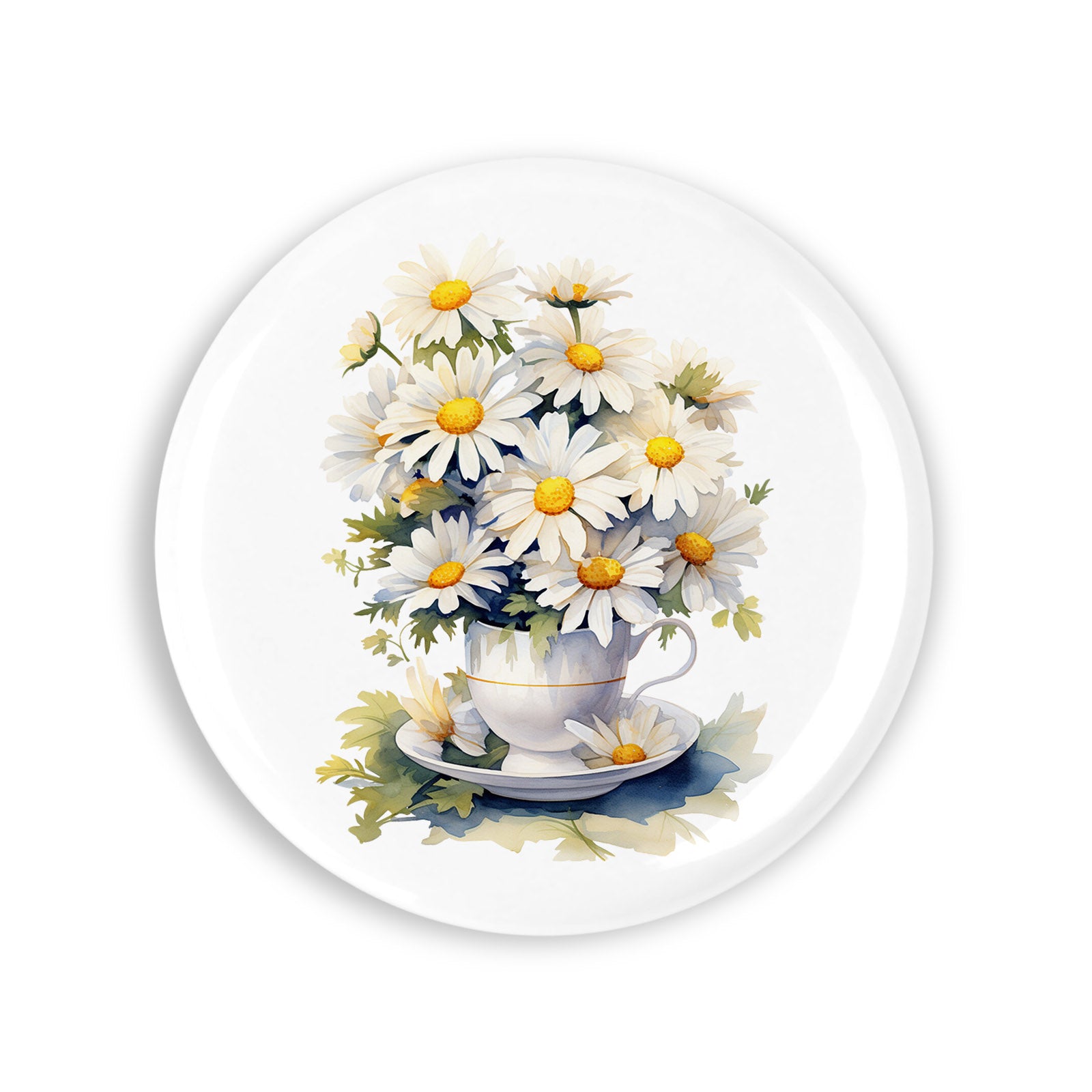 Set 4 insigne, Ceasca de cafea cu flori albe, NO5650, Metal, 44 mm, Multicolor
