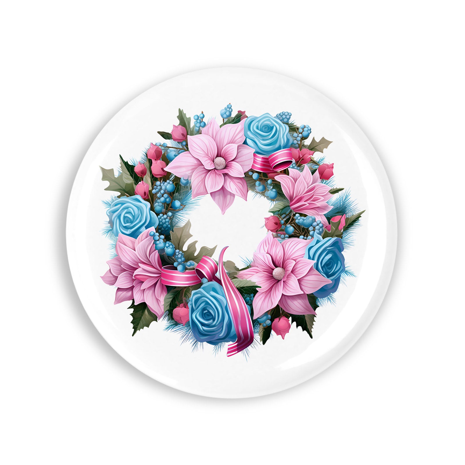 Set 4 insigne, Craciun roz bleu Coronita cu trandafiri albastri, NO2408, Metal, 44 mm, Multicolor