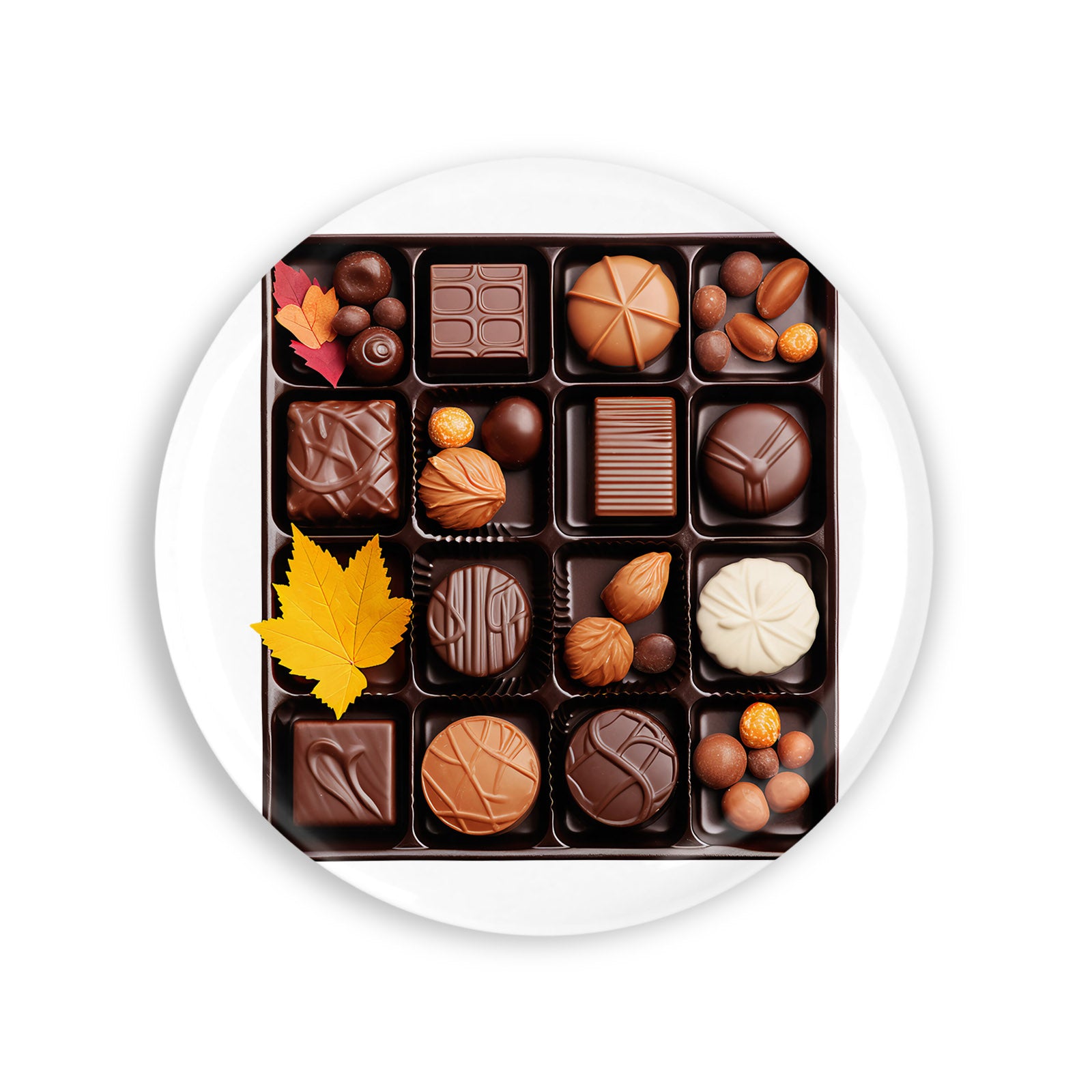 Set 4 insigne, Cutie cu bomboane de ciocolata de toamna, NO1989, Metal, 44 mm, Multicolor