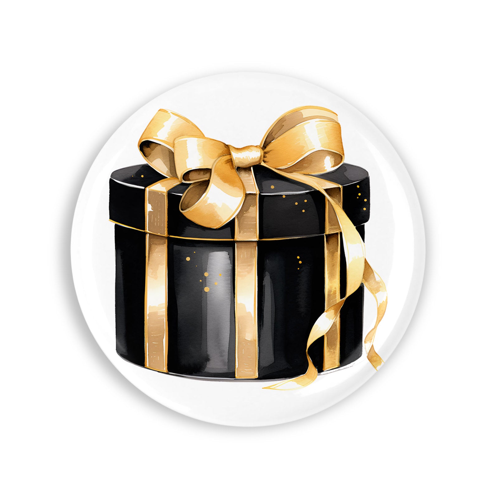 Set 4 insigne, Cutie de cadou rotunda neagru cu funda aurie, NO1428, Metal, 44 mm, Multicolor