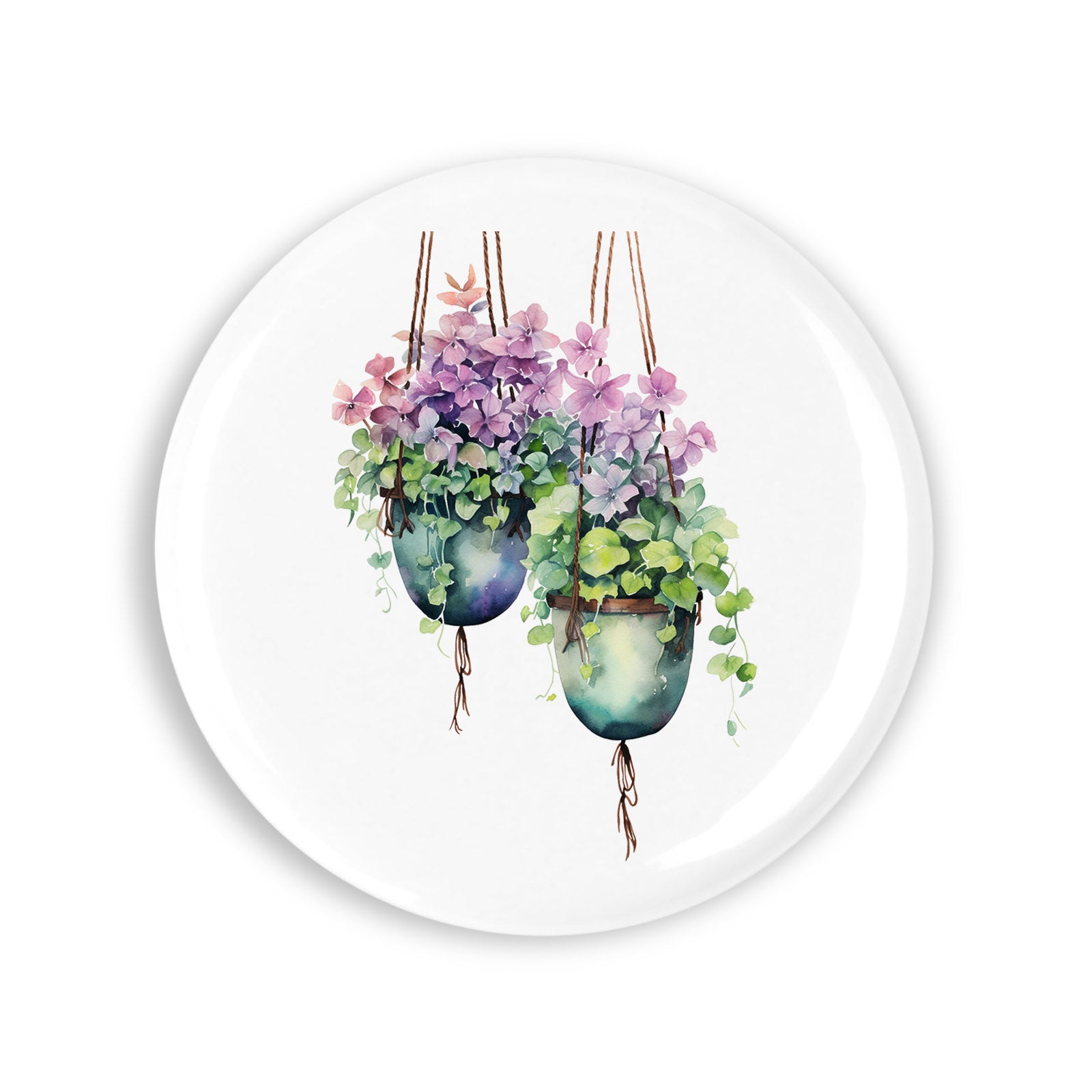 Set 4 insigne, Doua ghivece suspendate cu flori mov si roz, NO4375, Metal, 44 mm, Multicolor