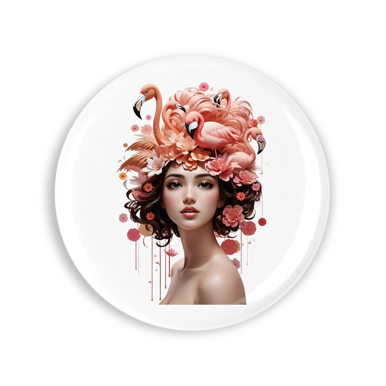 Set 4 insigne, Fata cu palarie flamingo, NO6638, Metal, 44 mm, Multicolor