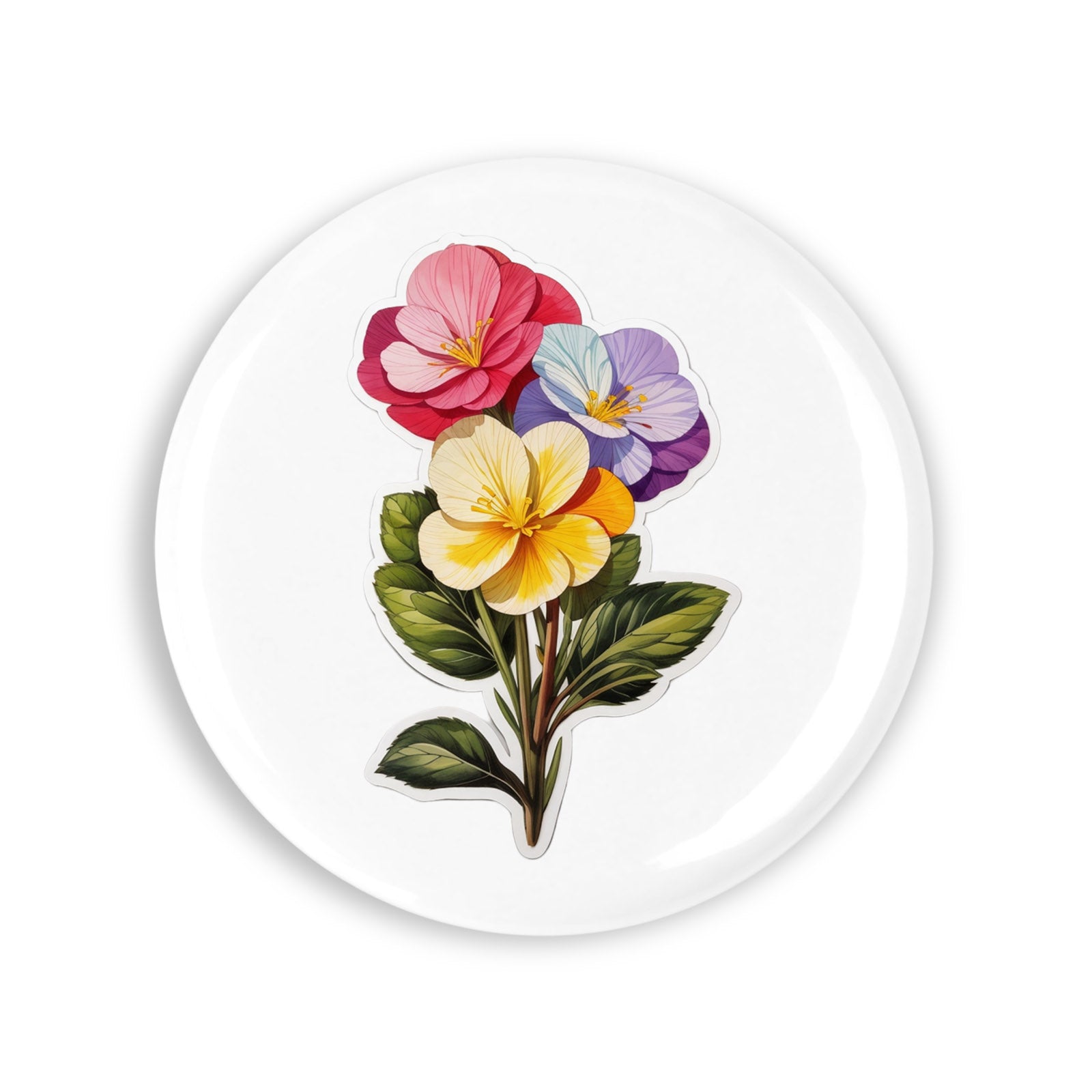 Set 4 insigne, Flori de primula cu frunze, NO8772, Metal, 44 mm, Multicolor