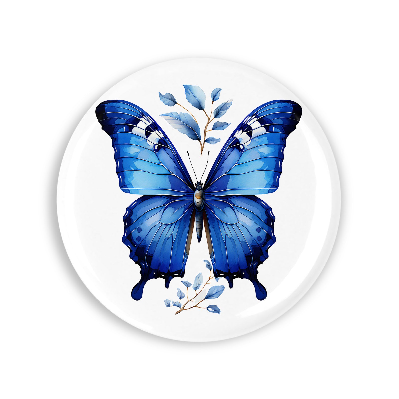 Set 4 insigne, Fluture albastru pe crengute cu frunze albastre, NO2425, Metal, 44 mm, Multicolor