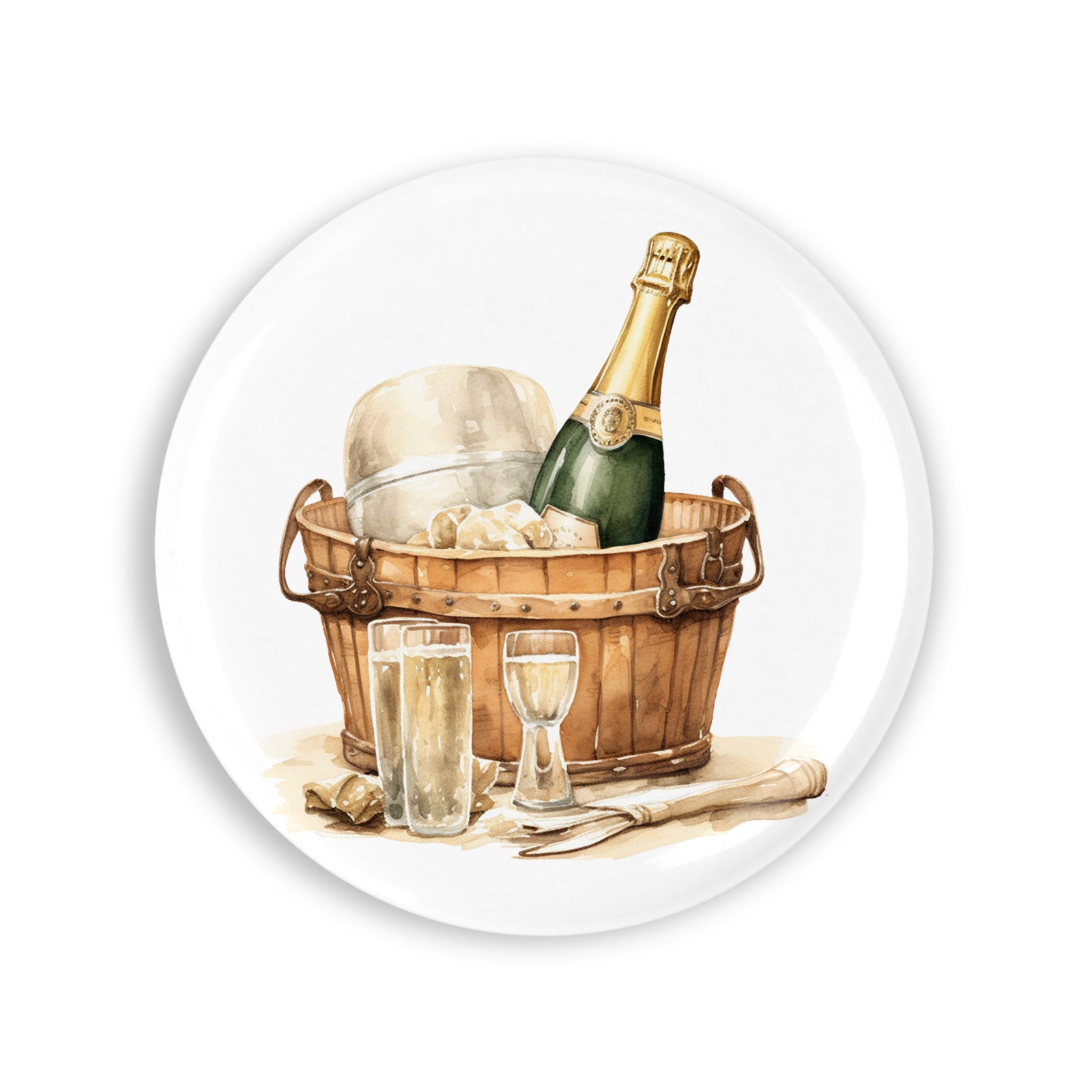 Set 4 insigne, Galeata de lemn cu sticla de sampanie, NO4281, Metal, 44 mm, Multicolor