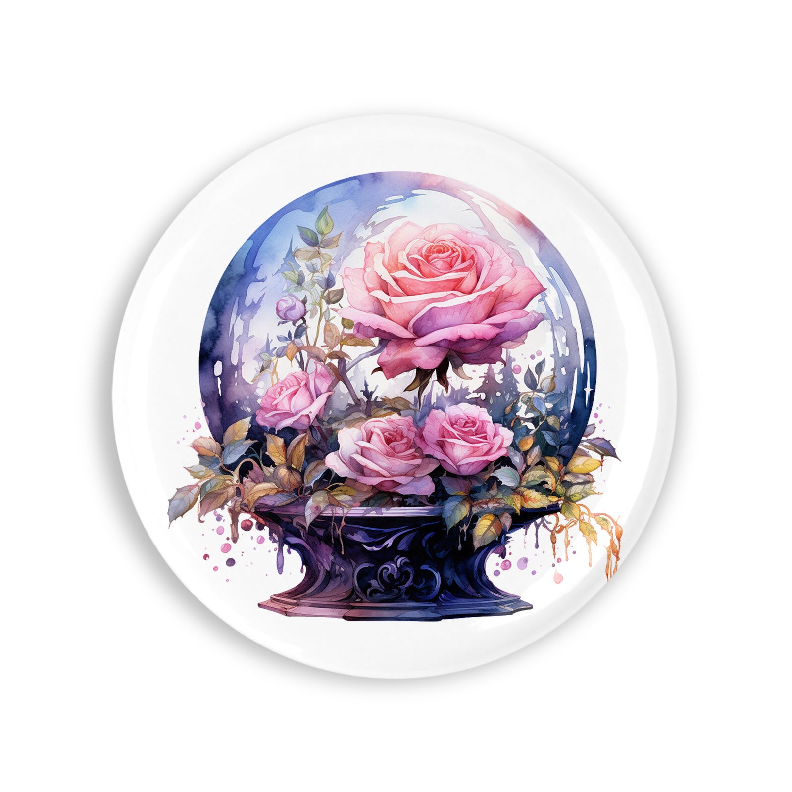 Set 4 insigne, Globul de cristal cu trandafiri roz si frunze galbene, NO3835, Metal, 44 mm, Multicolor