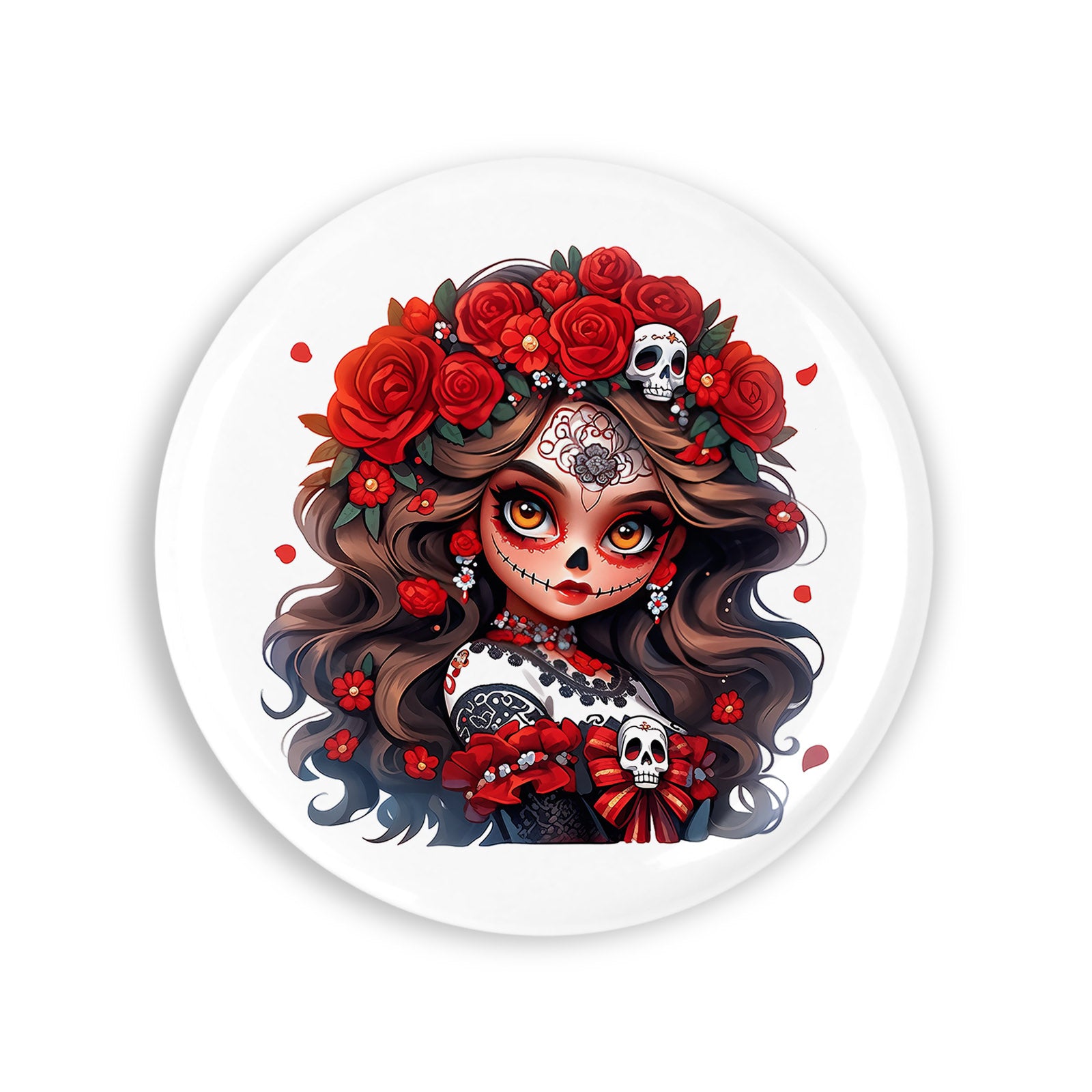 Set 4 insigne, Halloween Fata cu trandafiri in par si cranii, NO574, Metal, 44 mm, Multicolor