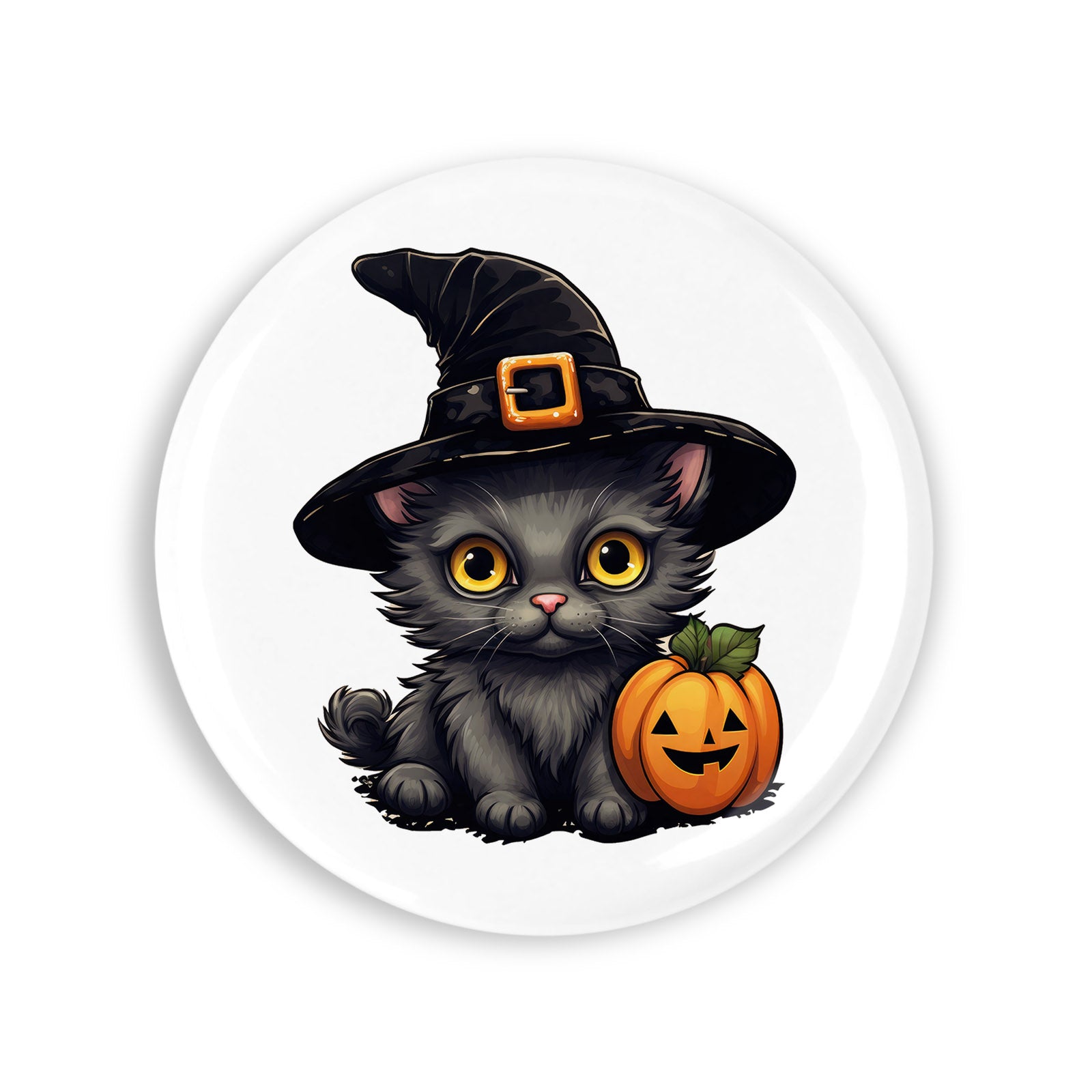 Set 4 insigne, Halloween Pisica neagra cu joben de vrajitoare, NO4066, Metal, 44 mm, Multicolor