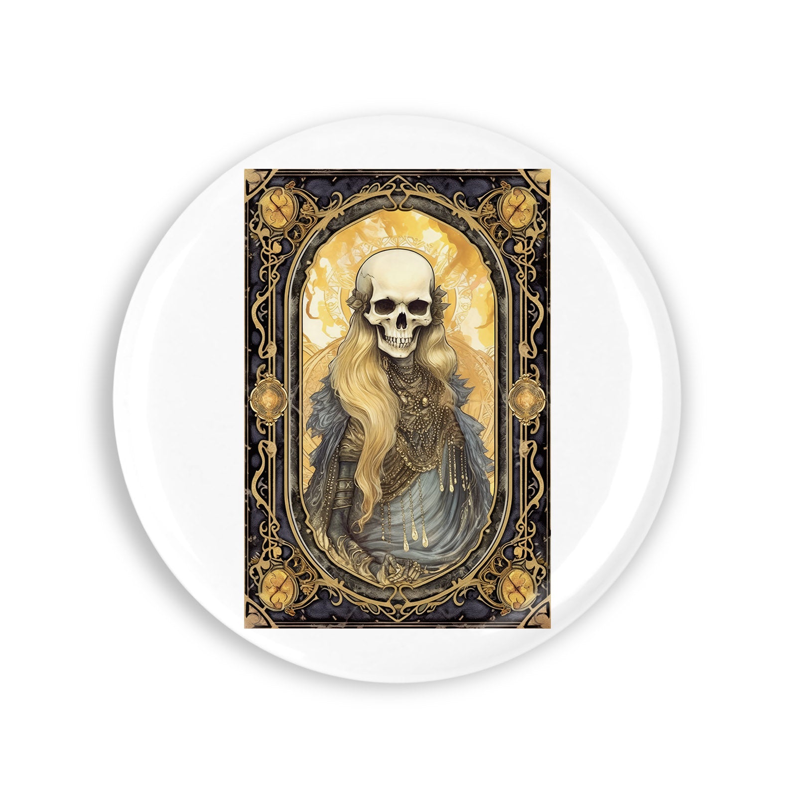 Set 4 insigne, Halloween Tarot Sceletul cu aur, NO5050, Metal, 44 mm, Multicolor