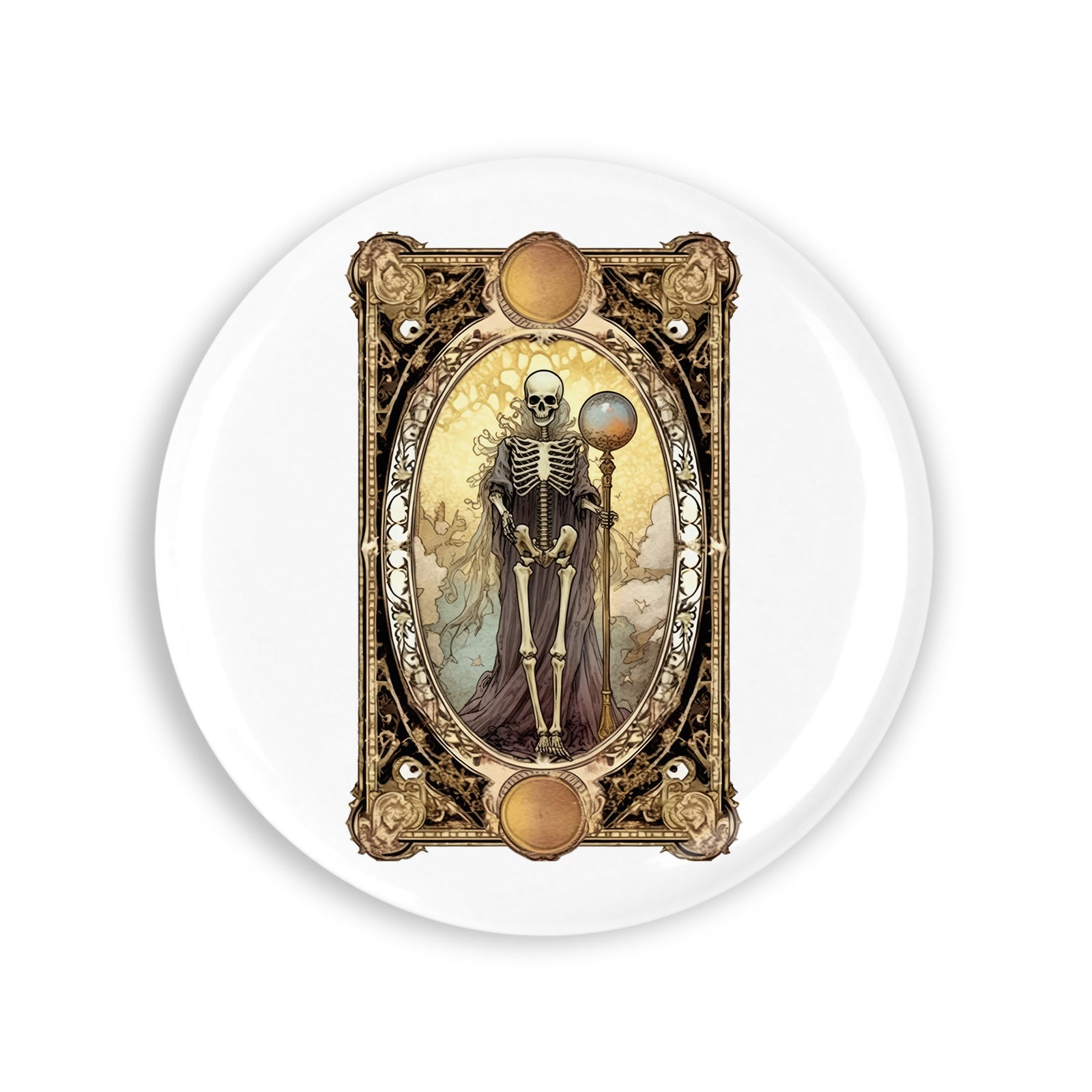 Set 4 insigne, Halloween Tarot Scheletul cu sceptrul pamantului, NO3460, Metal, 44 mm, Multicolor