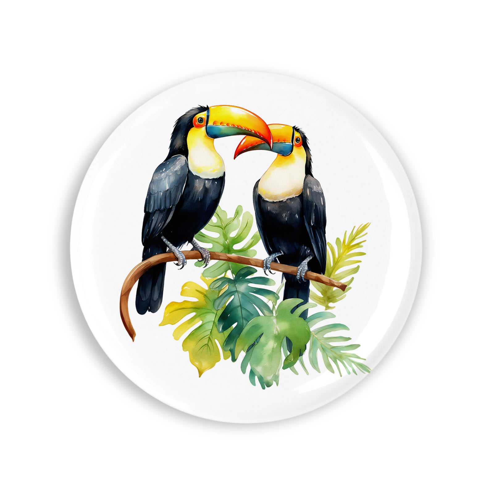 Set 4 insigne, Papagali Tucan pe ramura cu frunze, NO368, Metal, 44 mm, Multicolor