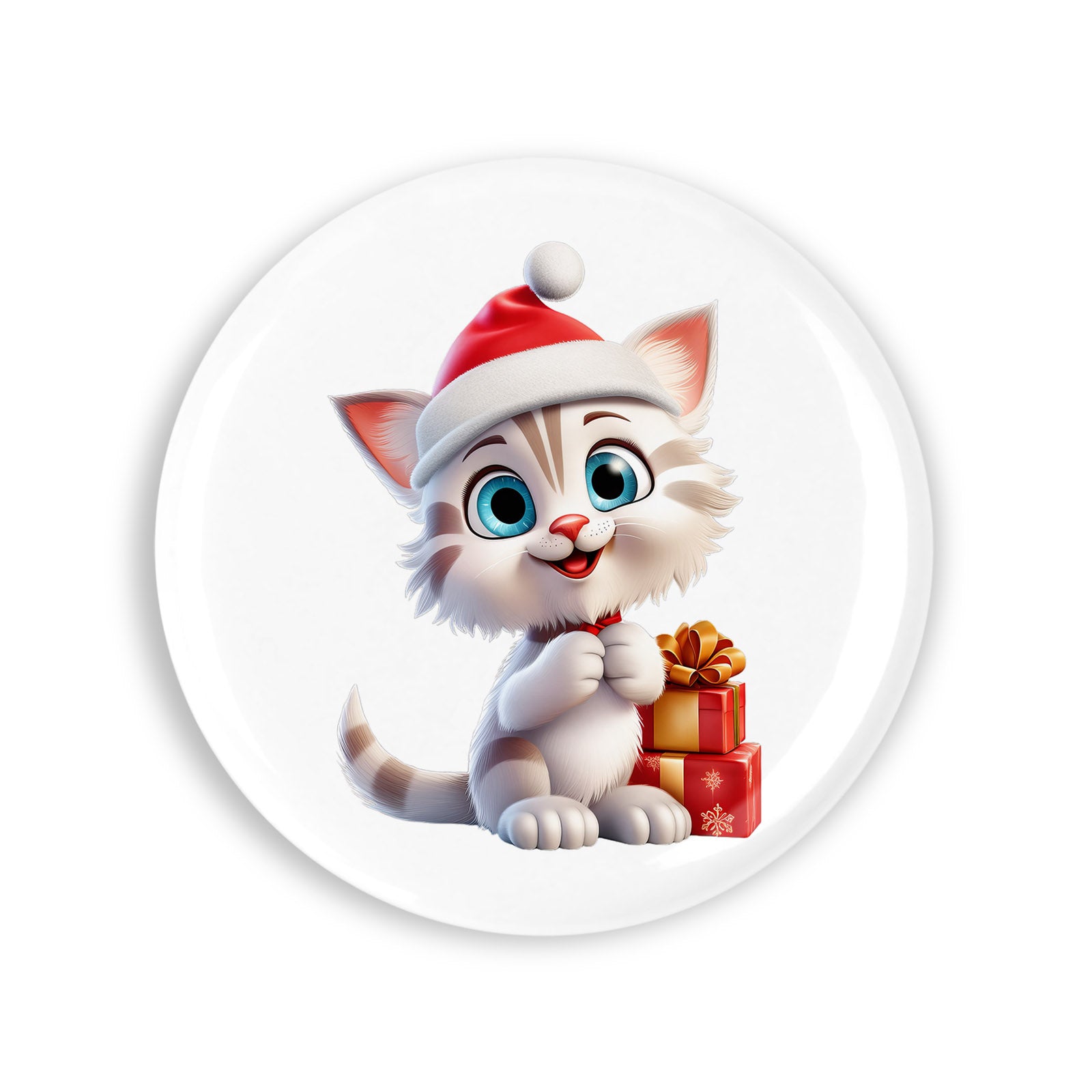 Set 4 insigne, Pisica alba cu cadouri de craciun, NO5787, Metal, 44 mm, Multicolor