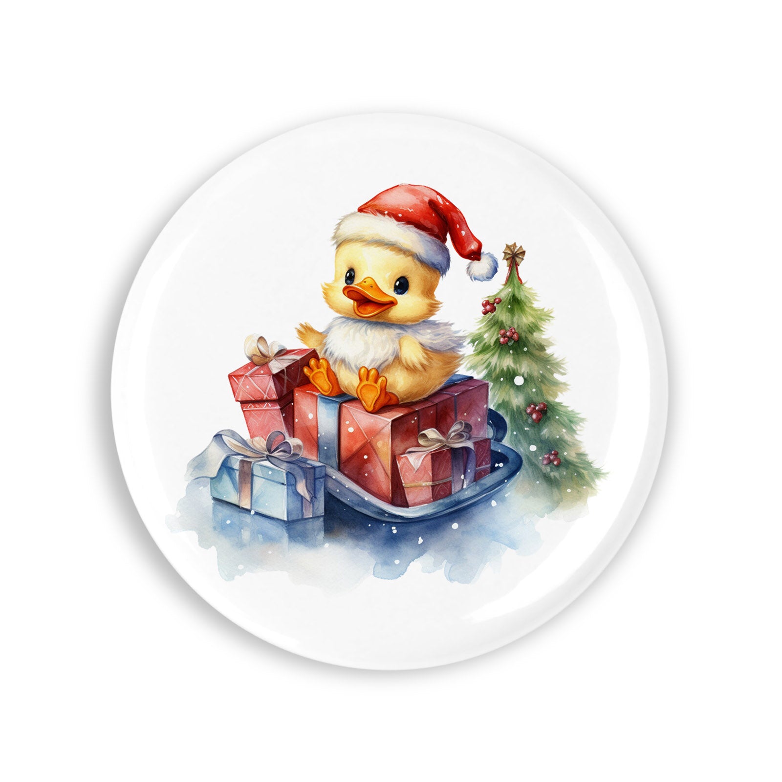 Set 4 insigne, Puiul galben aduce cadouri de craciun, NO4701, Metal, 44 mm, Multicolor