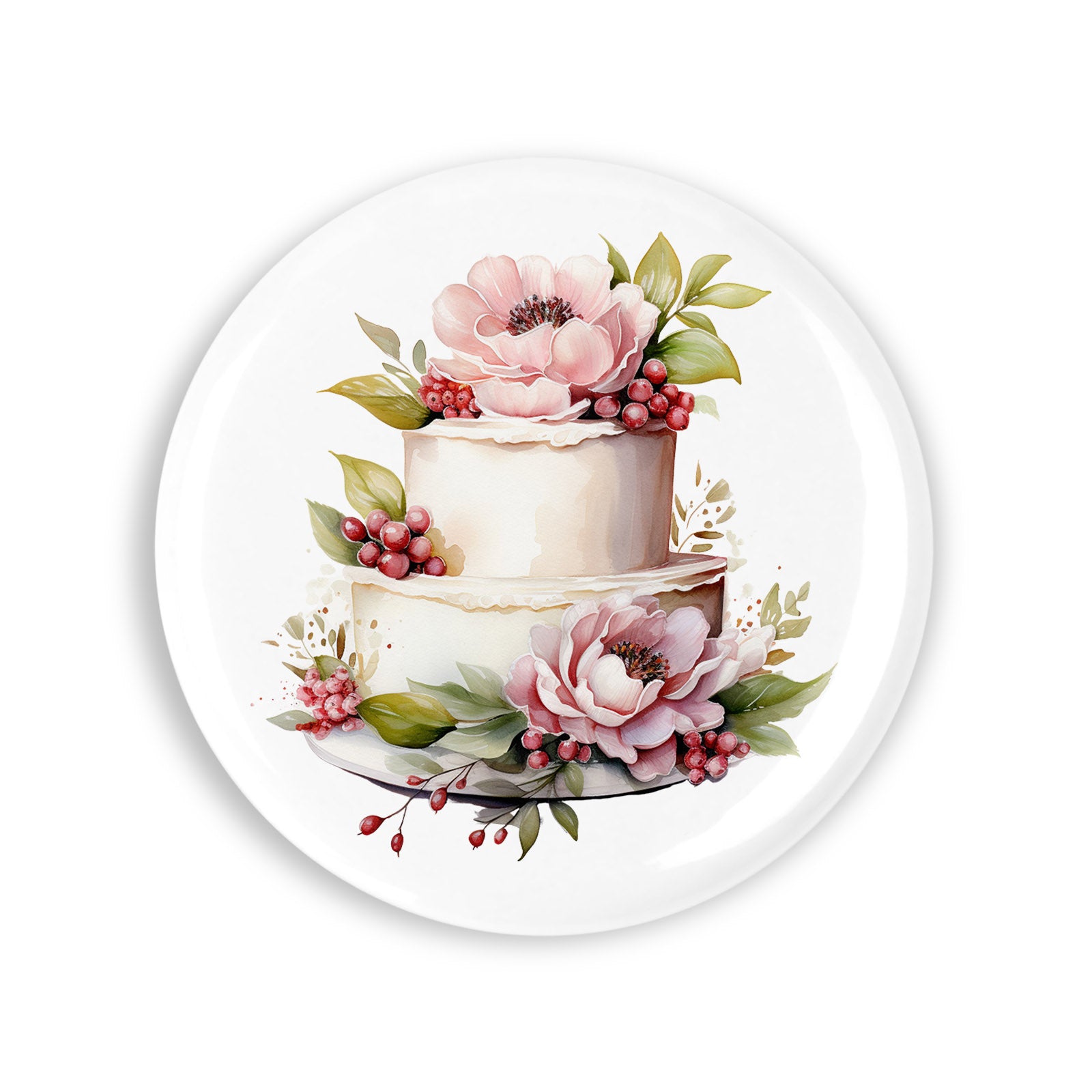 Set 4 insigne, Tort de nunta cu fructe si flori roz, NO2912, Metal, 44 mm, Multicolor