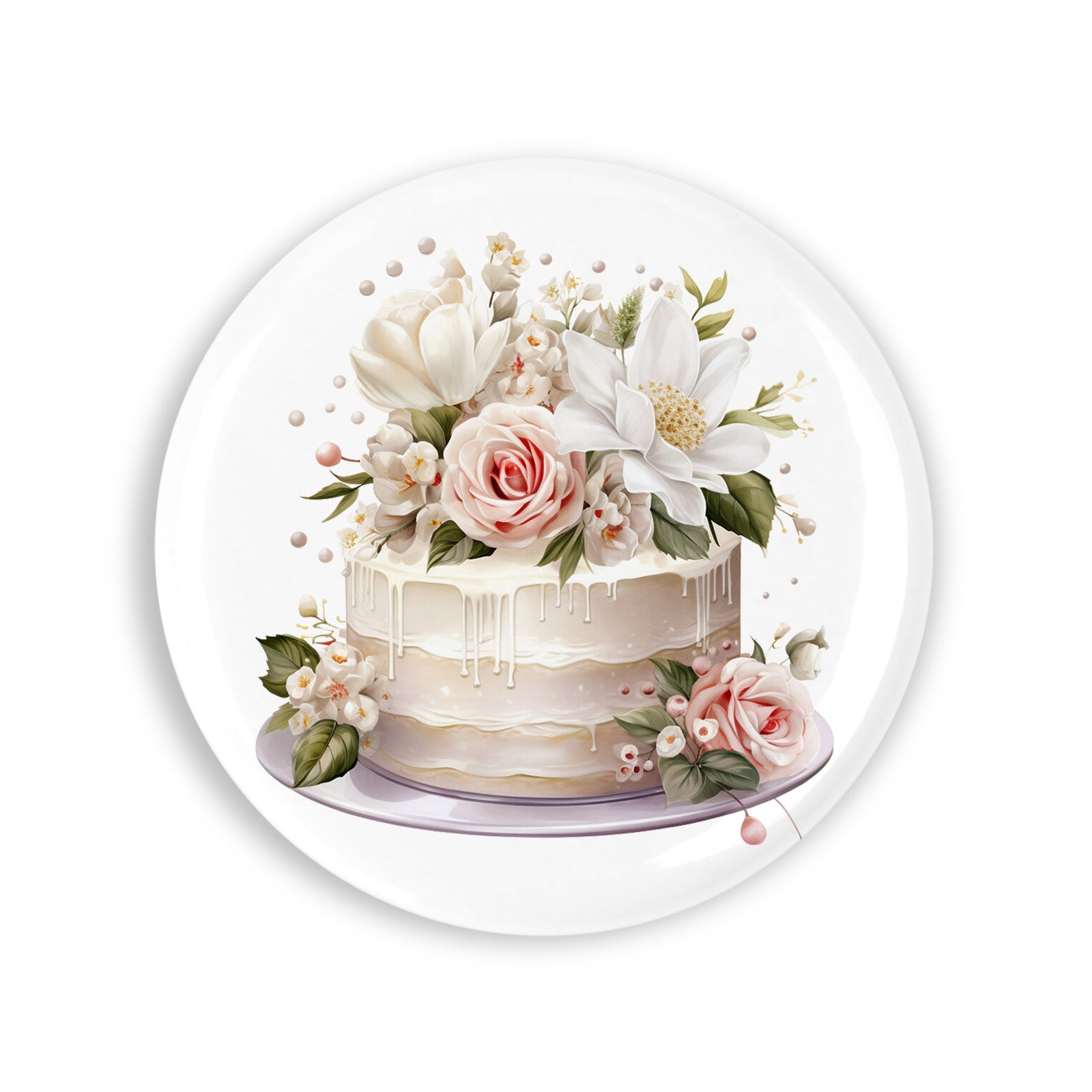 Set 4 insigne, Tort de nunta cu trandafiri roz si flori albe, NO629, Metal, 44 mm, Multicolor