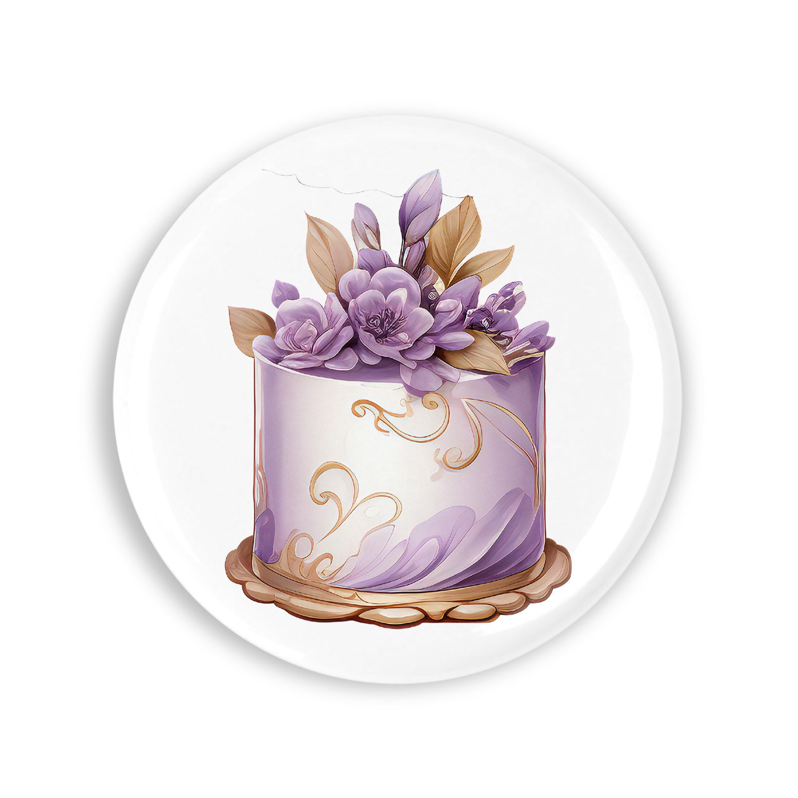 Set 4 insigne, Tort mov cu flori si frunze bej, NO4463, Metal, 44 mm, Multicolor