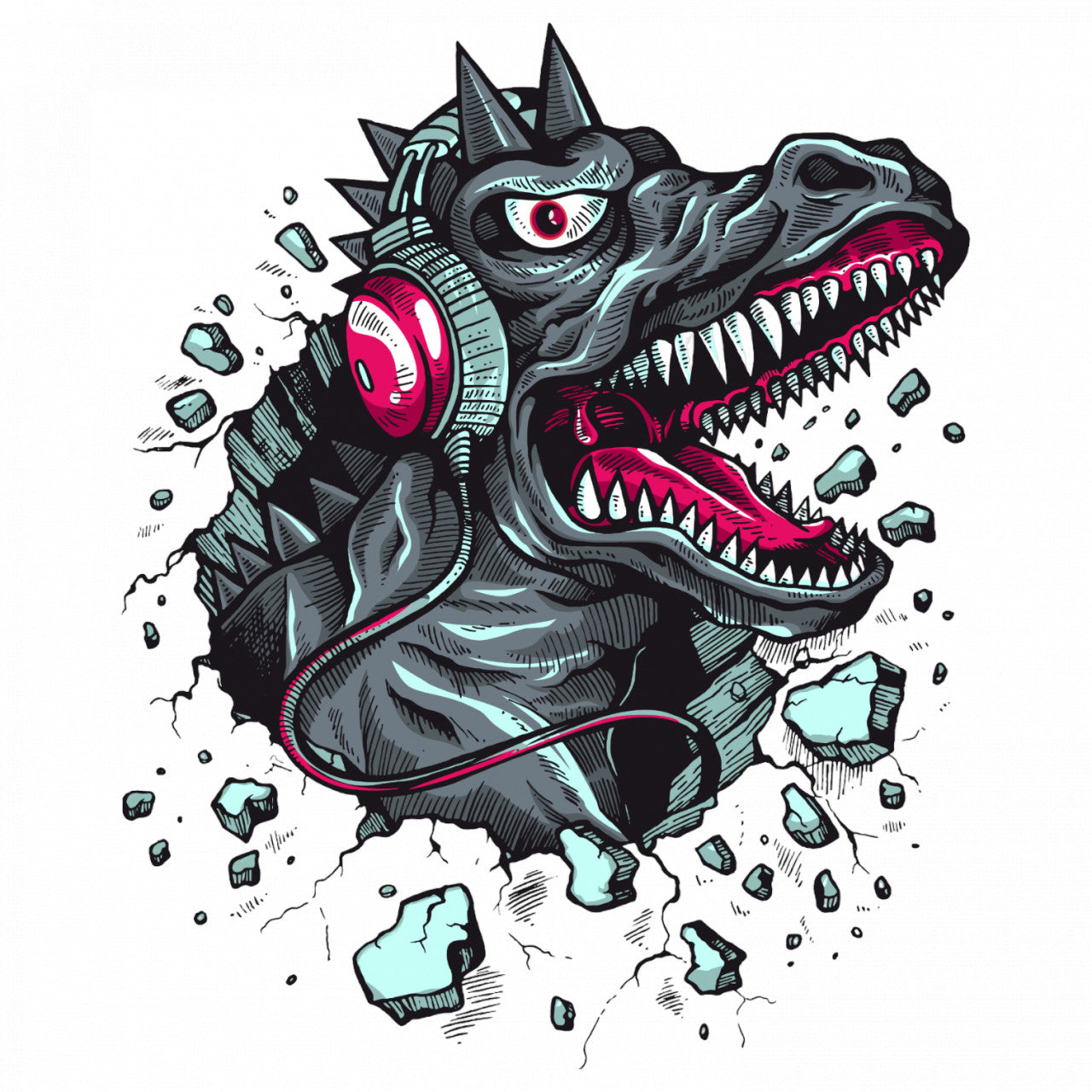 Set 5 bucati, Sticker decorativ, Dinozaurul asculta la casti, Rezistent la apa, NO9023, 6 cm, Multicolor