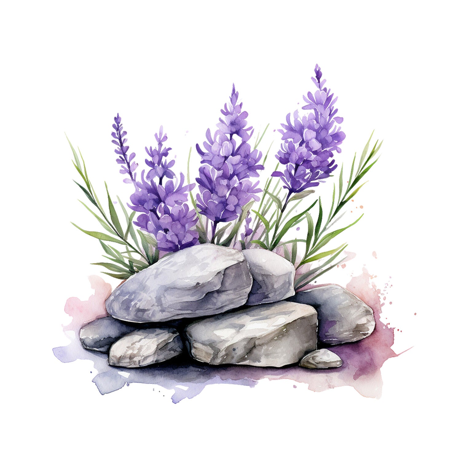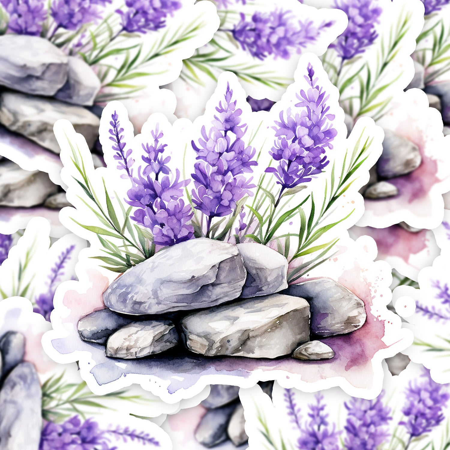 Set 5 bucati, Sticker decorativ, Lavanda si pietre, Rezistent la apa, NO13982, 6 cm, Multicolor