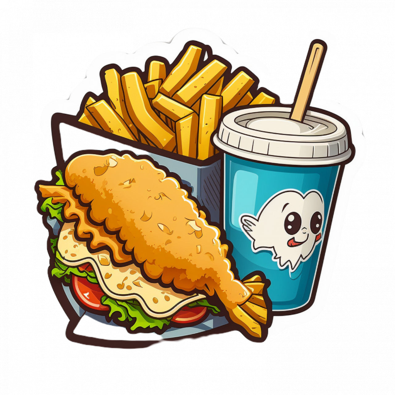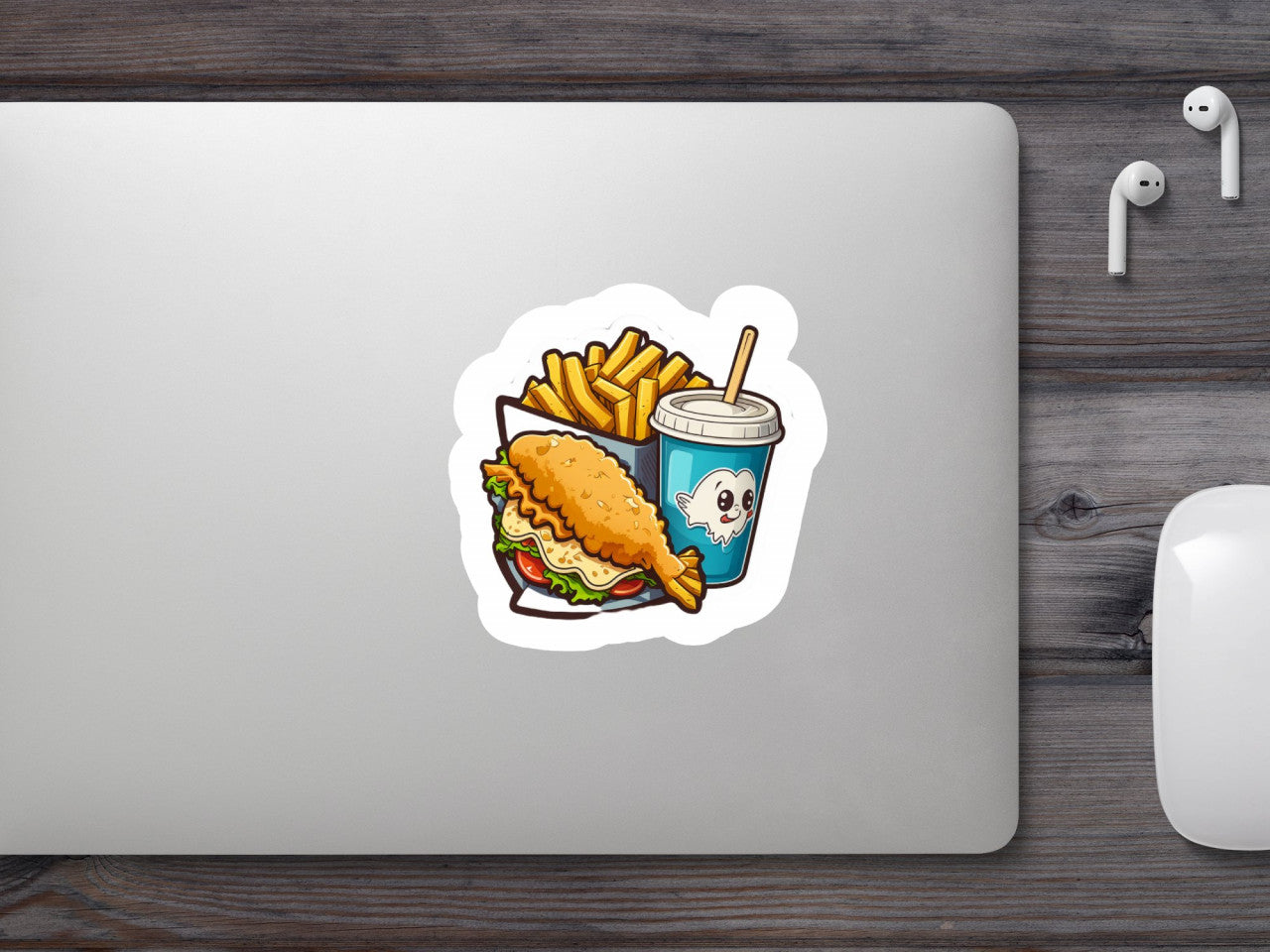 Set 5 bucati, Sticker decorativ, Meniu cu peste si cartofi prajiti, Rezistent la apa, NO10070, 6 cm, Multicolor