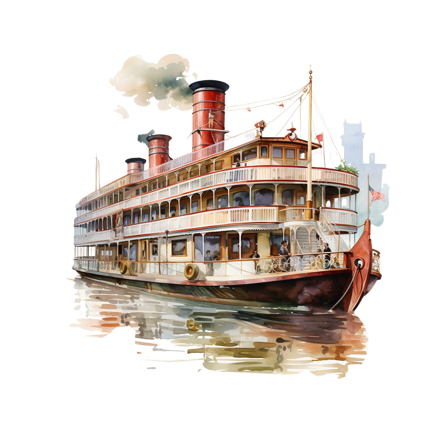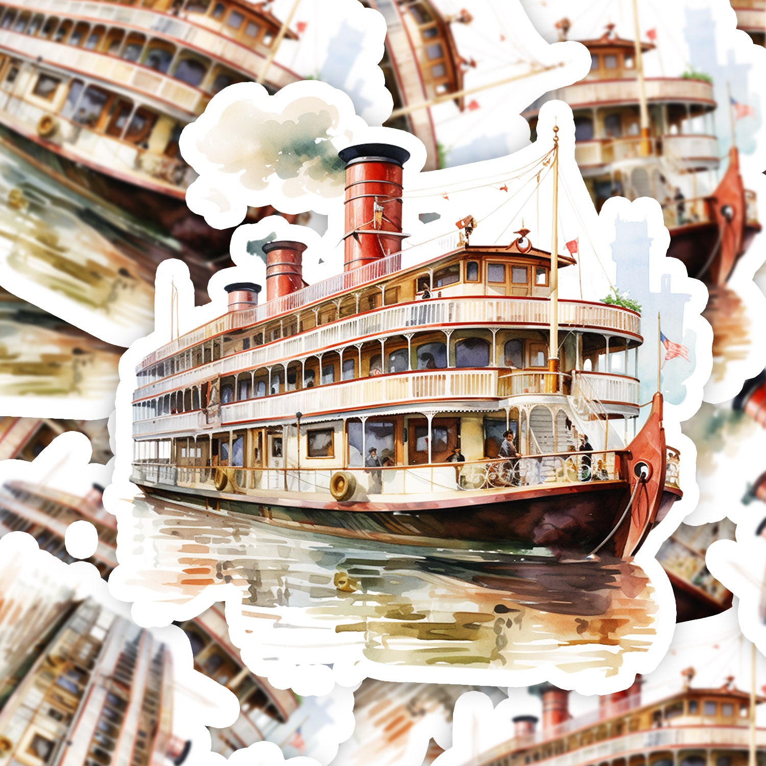 Set 5 bucati, Sticker decorativ, Nava fluviala cu aburi alb rosu, Rezistent la apa, NO15153, 6 cm, Multicolor