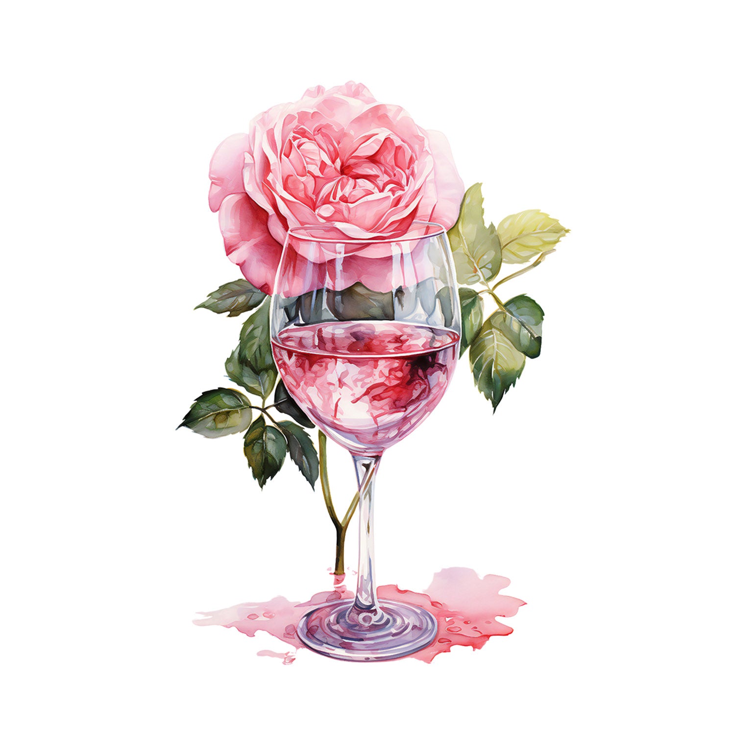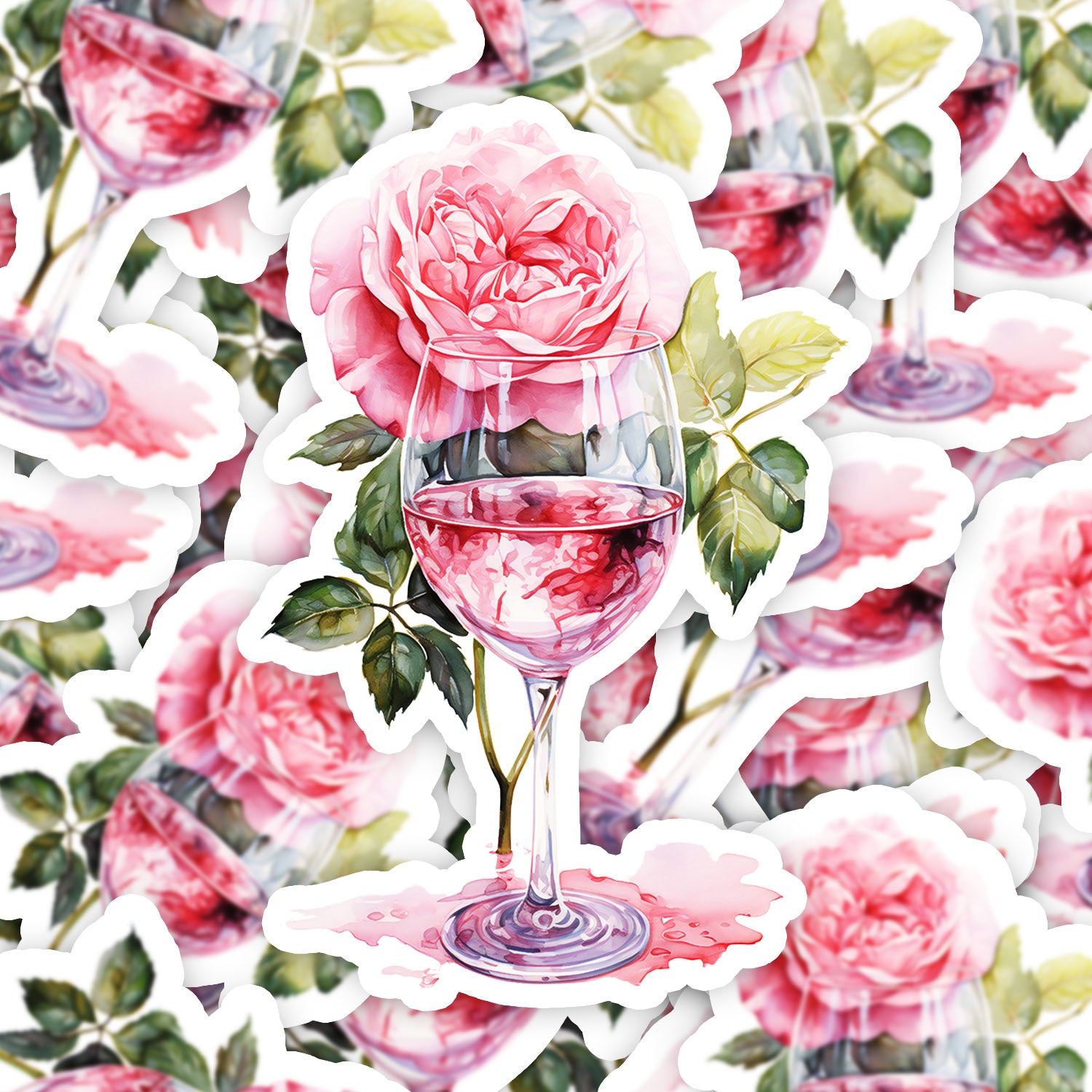Set 5 bucati, Sticker decorativ, Pahar cu vin si trandafir roz, Rezistent la apa, NO15369, 6 cm, Multicolor