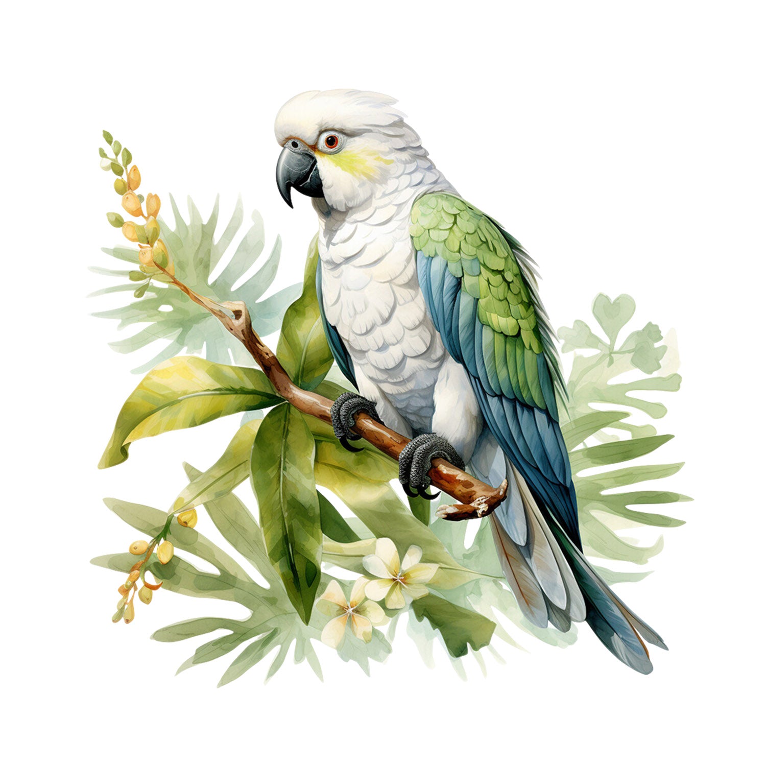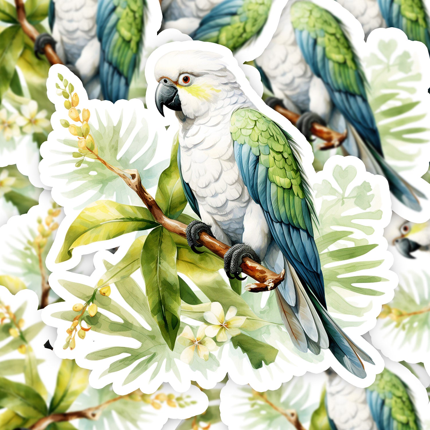 Set 5 bucati, Sticker decorativ, Papagal alb in eucalipt, Rezistent la apa, NO10688, 6 cm, Multicolor