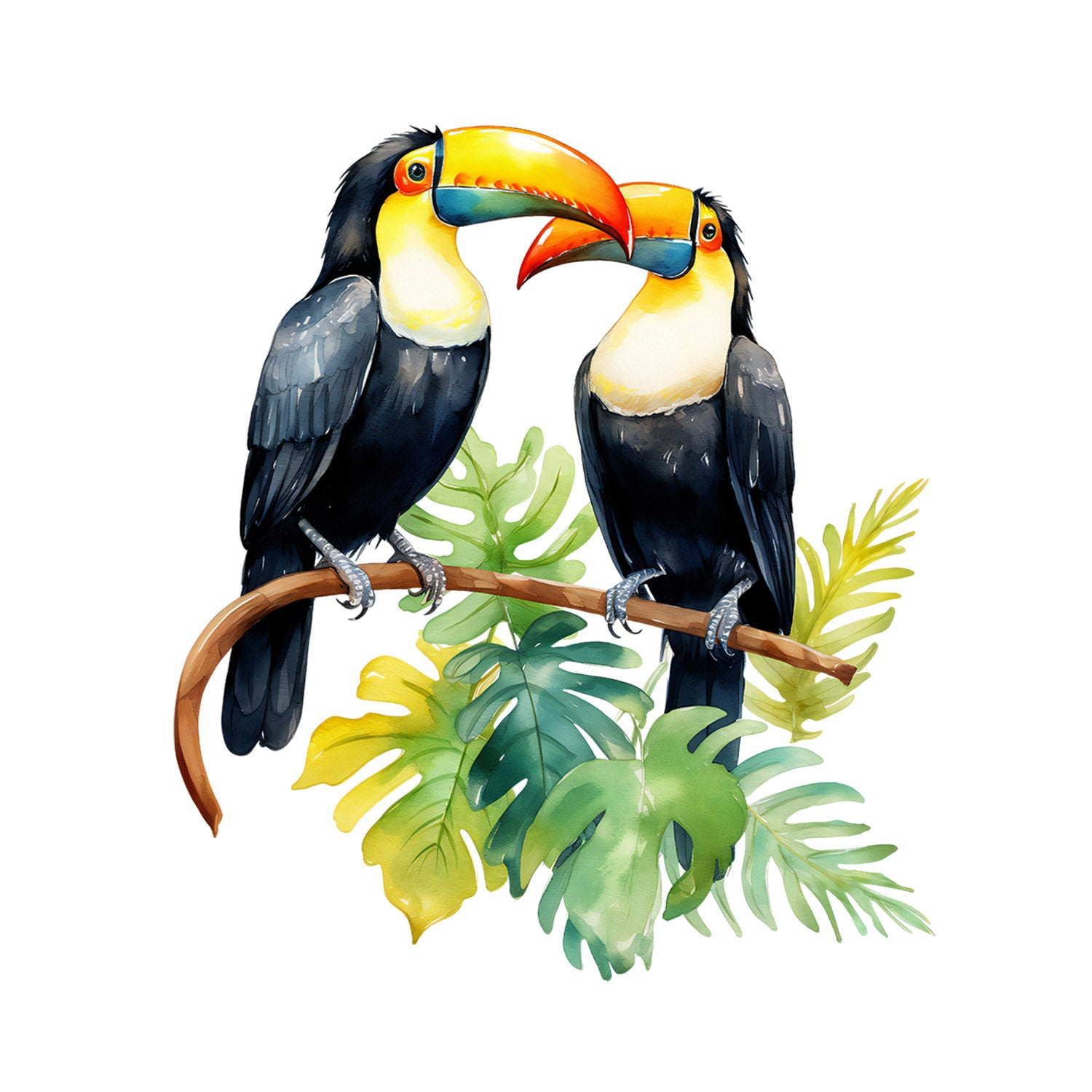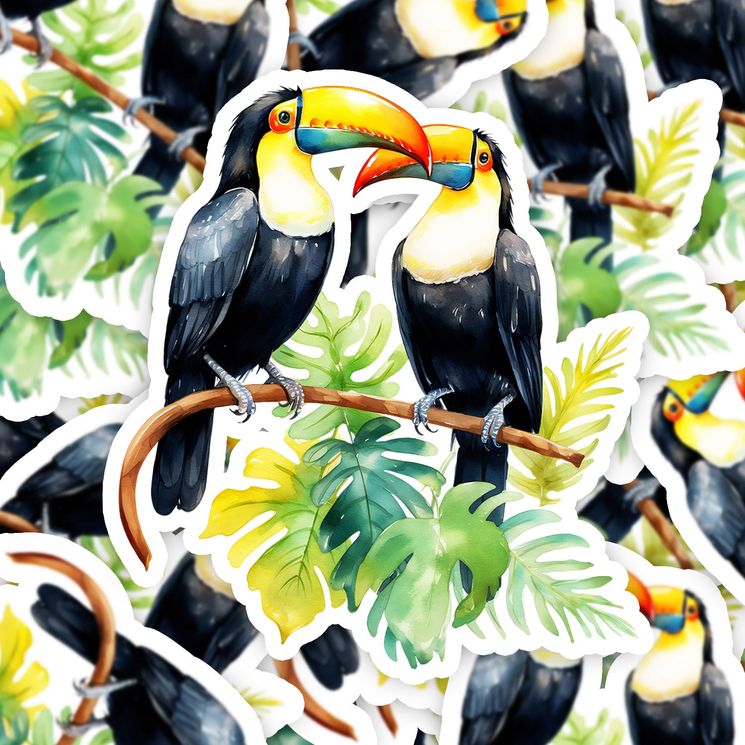 Set 5 bucati, Sticker decorativ, Papagali Tucan pe ramura cu frunze, Rezistent la apa, NO10369, 6 cm, Multicolor