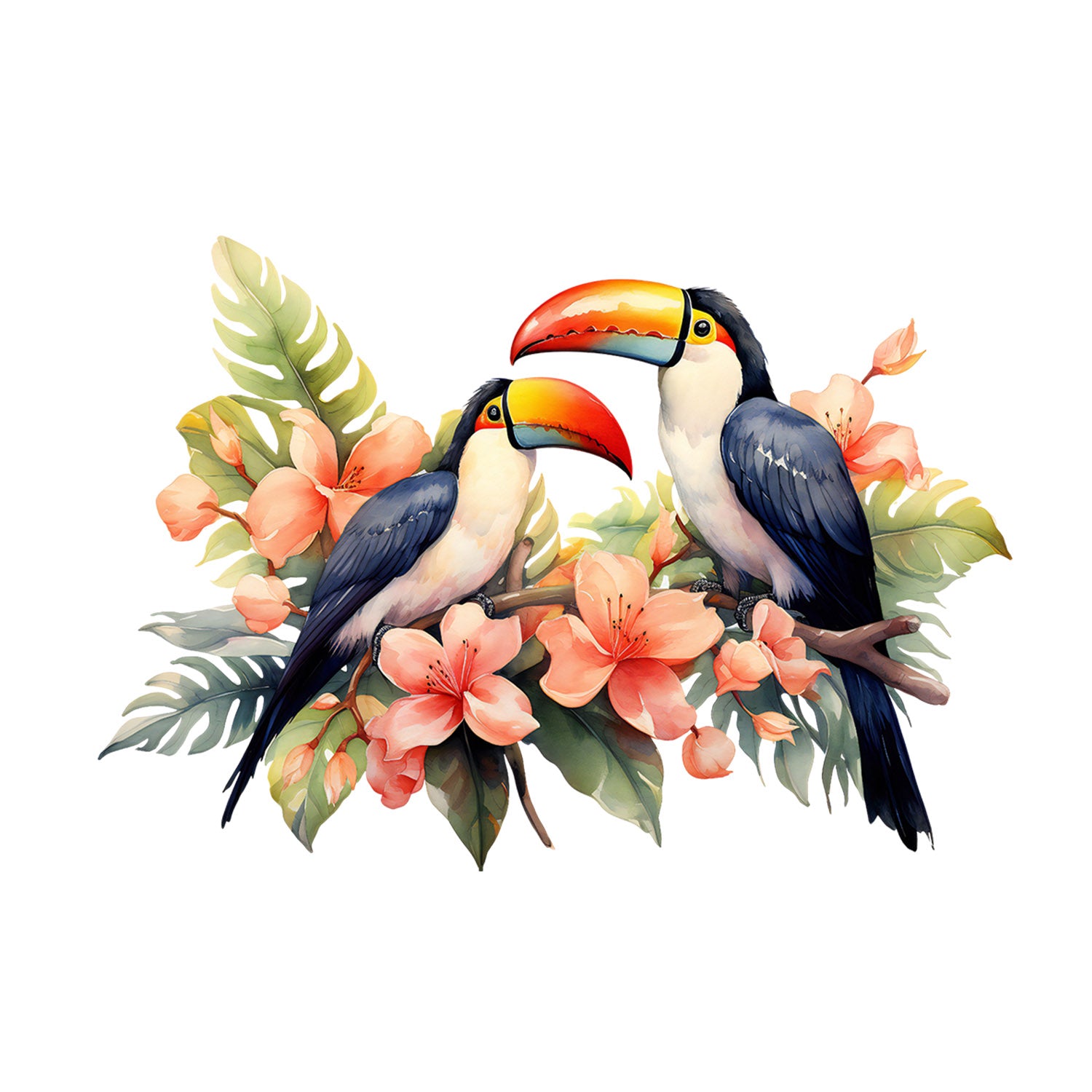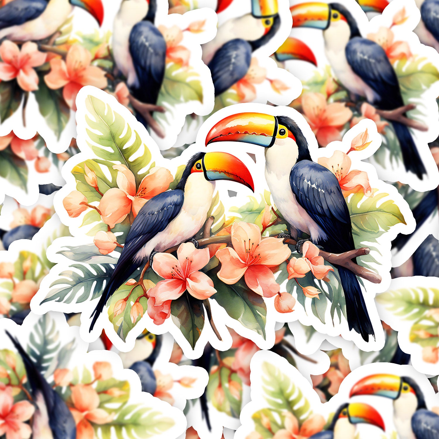 Set 5 bucati, Sticker decorativ, Papagali Tucan se odihnesc pe ramura tropicala, Rezistent la apa, NO10819, 6 cm, Multicolor