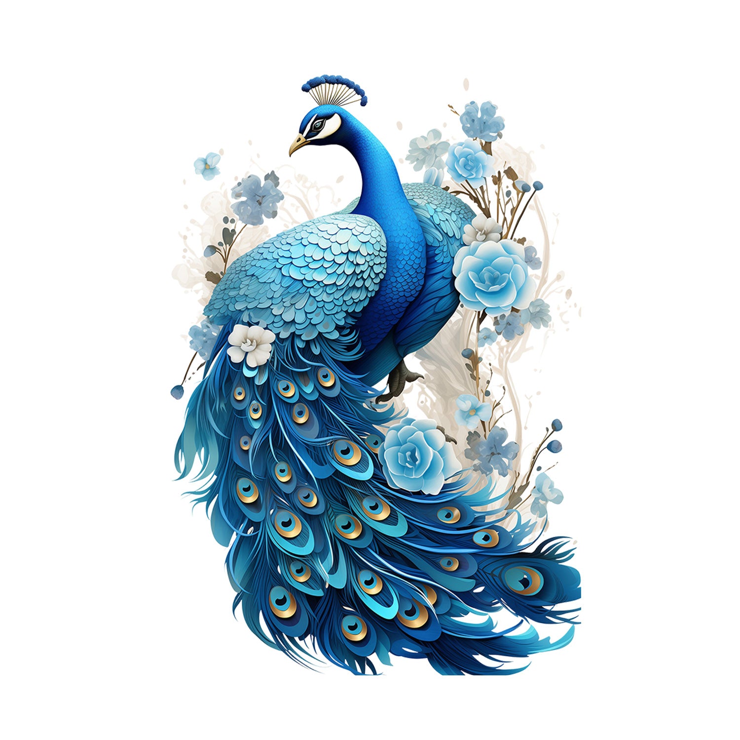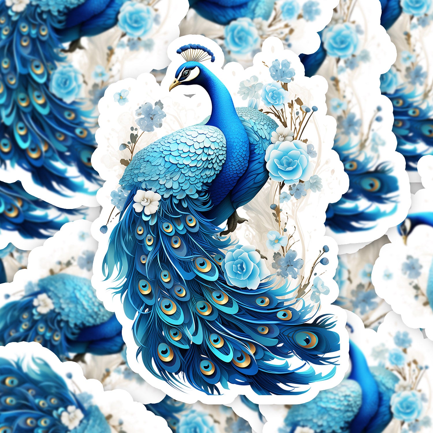 Set 5 bucati, Sticker decorativ, Paun albastru cu trandafiri bleu, Rezistent la apa, NO15909, 6 cm, Multicolor
