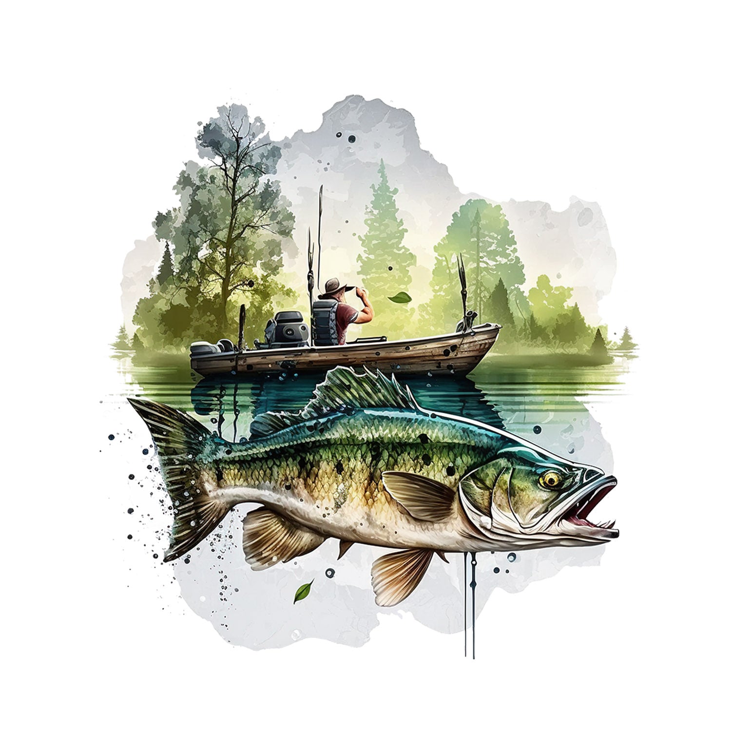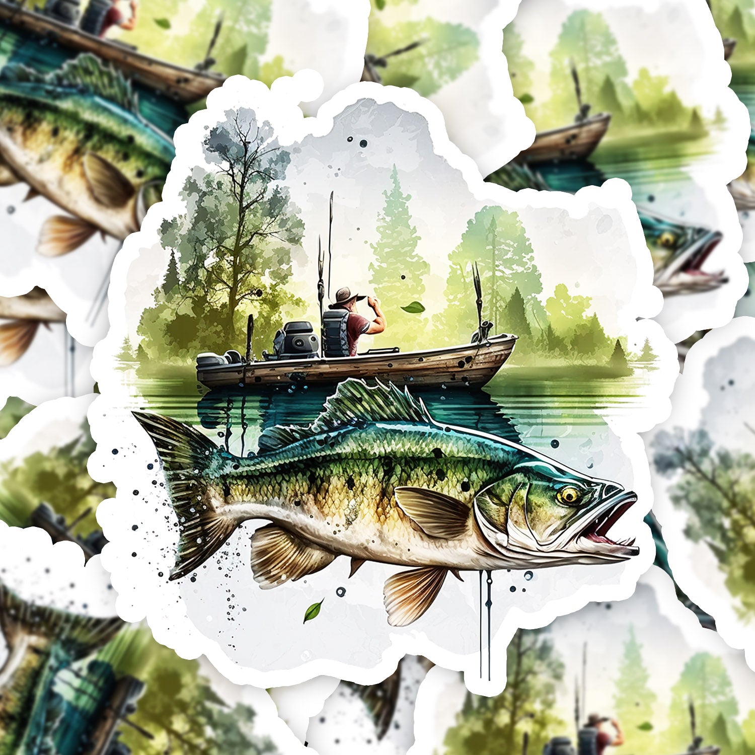 Set 5 bucati, Sticker decorativ, Pescar in barca pe lacul din padure, Rezistent la apa, NO10967, 6 cm, Multicolor