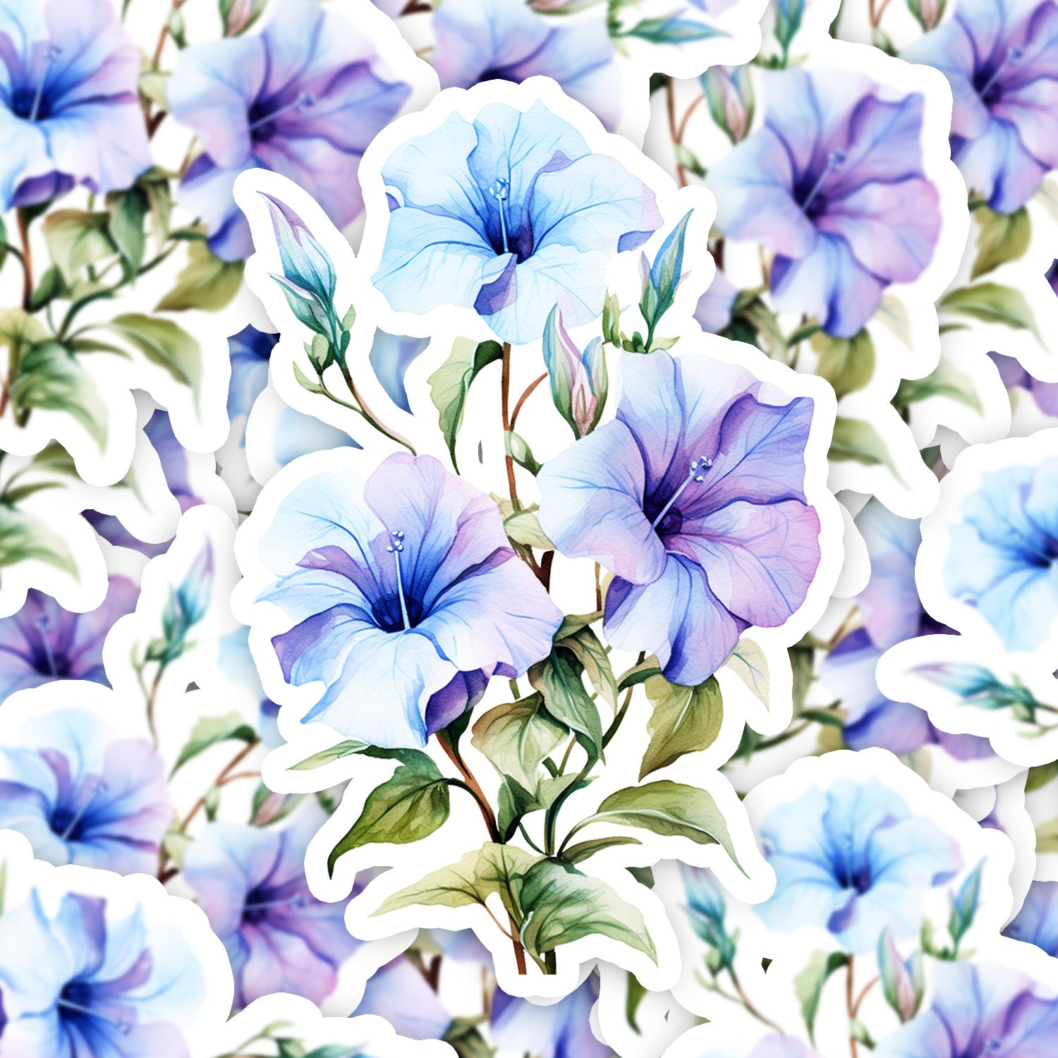 Set 5 bucati, Sticker decorativ, Petunii mov albastru cu bobocei, Rezistent la apa, NO16378, 6 cm, Multicolor